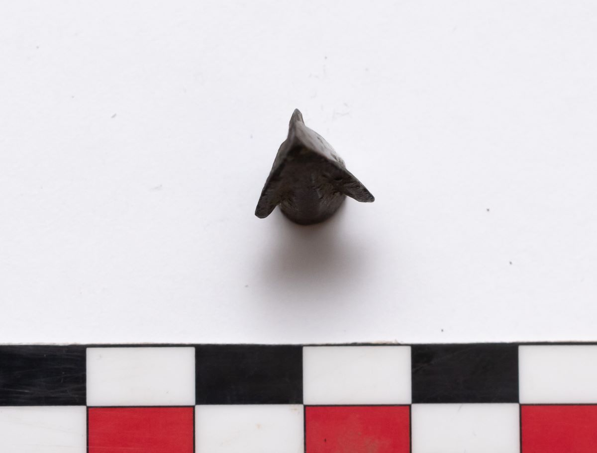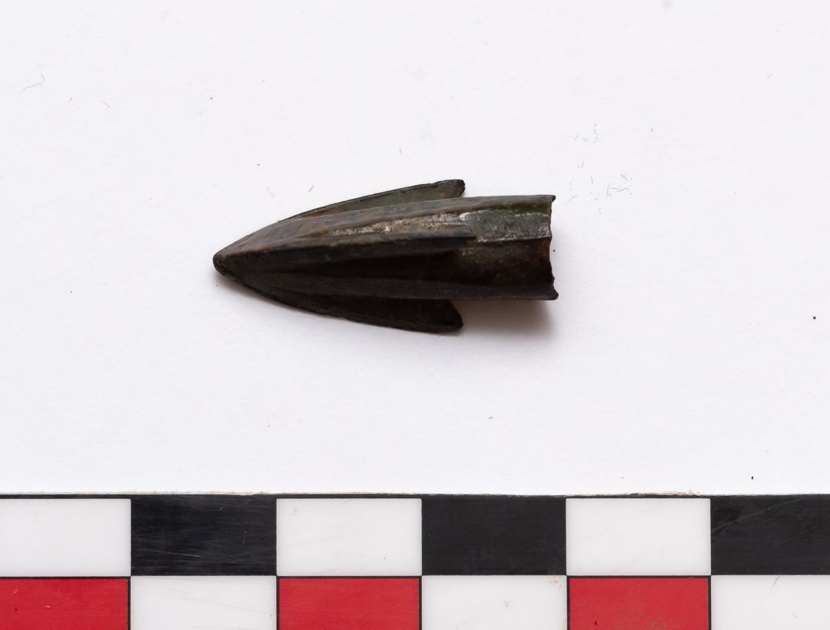 Descriere: Vârf de săgeată din bronz, cu trei muchii alungite în partea inferioră (spini), prevăzut cu tub de înmănușare.