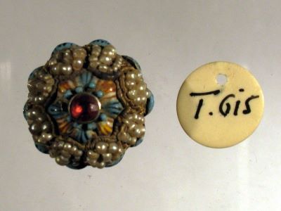 Material/Tehnică (text): argint; 93 perle; 1 sticlă roșie; alte materiale (2 g)