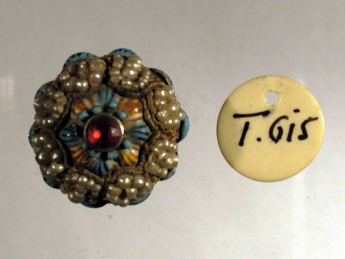 Descriere: Ac de voal pentru port popular săsesc, în formă florală, cu decor spiralat, monturi de perle mici, o sticlă roșie și petale pictate cu email.