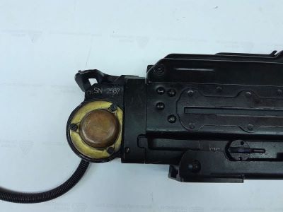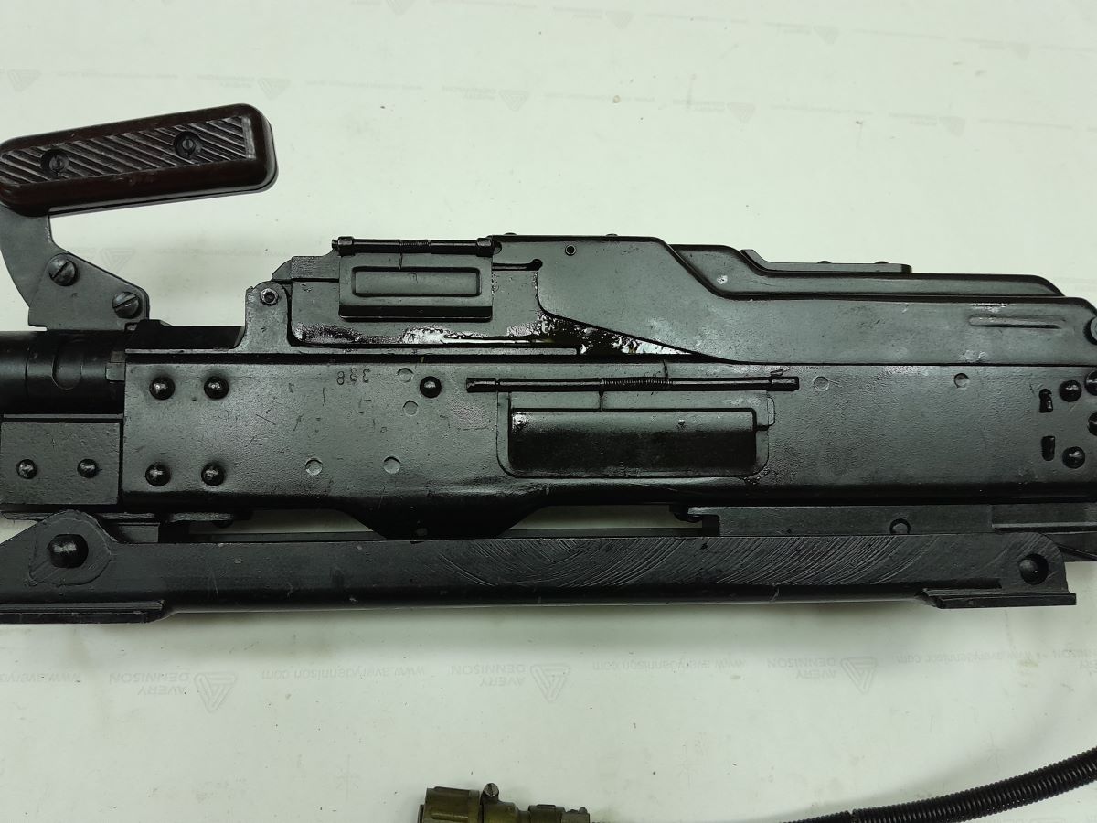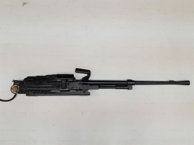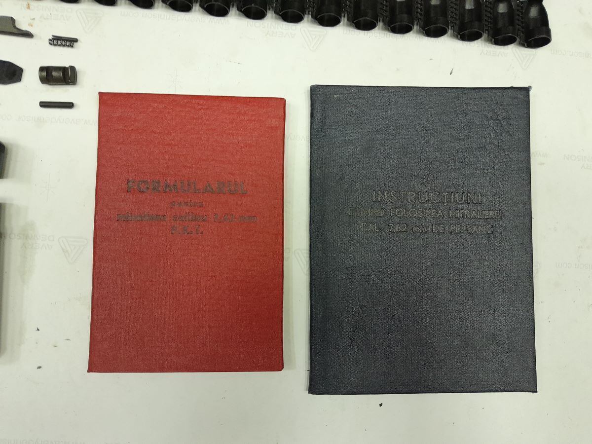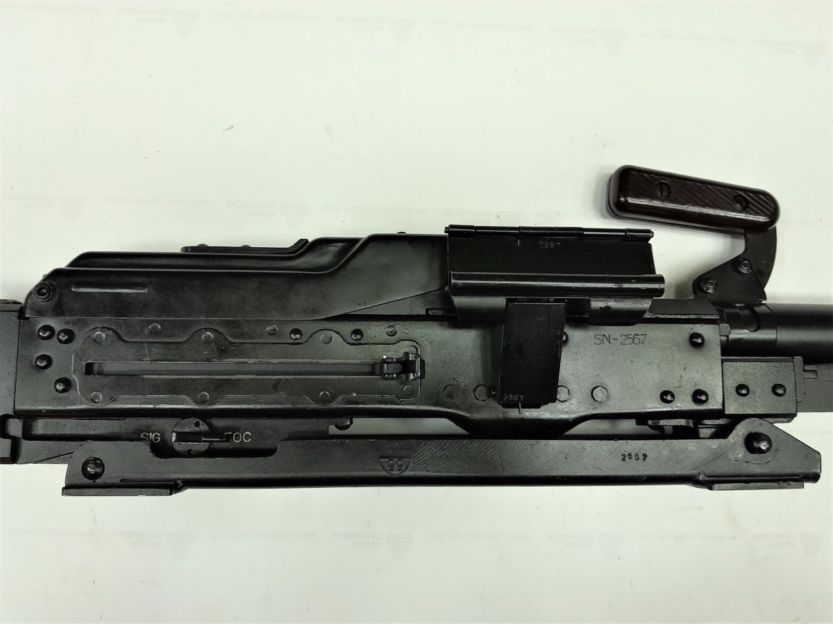 Descriere: Mitralieră „PKT”, seria „SN-2567”, calibrul 7,62x54r, fabricată în Romania, la Cugir în 1979. Arma este confecționată din oțel vopsit negru. - Cutia mecanismului este confecționată din tablă de oțel ambutisată. Pe aceasta sunt fixate prin nituire și sudare garda tragaciului, rampa de încărcare, țeava armei și țeava pistonului, patul armei. Pe partea dreaptă se află levierul selectorului de siguranță marcat „SIG” în spate și „FOC” în față. Pe partea dreaptă a cutiei mecanismului, în față, este gravată seria armei „SN-2567”. De asemenea, pe partea dreaptă a armei se află mânerul de armare. Orificiile aflate pe cutia mecanismelor pentru bandă și evacuare sunt acoperite cu capace din tablă cu arc. La parte din spate a cutiei mecanismului se află mecanismul trăgaciului electric și trăgaciul acționat manual cu siguranța acestuia, poziționate la partea superioară.Pe partea dreaptă a ansamblului trăgaciului este un capac din tablă de culoare galbenă (posibil alamă) fixat cu trei șuruburi asiguarate cu sârmă, deasupra acestuia este gravată seria armei „SN-2567”. Din acesta iese un cablu terminat cu un conector „mamă„ cu doi pini. - Capacul cutiei mecanismului pivotează în față și în interiorul acestuia este fixat ansamblul de ghidare a benzii. La partea superioară se găsesc marcajul fabricii „săgeata în triunghi”, urmat de seria armei „SN-2567” și anul de fabricație „1979”. Aceste marcaje sunt evidențiate cu alb. - Țeava este detașabilă și este marcatră la partea superioară, pe blocul de împrumut de gaze, cu seria „SN-2567”. Pe blocul de împrumut se află reglajul dimensiunii orificiului de împrumut marcat „1”, „2”, „3”, marcaje evidențiate cu roșu. Mânerul de transport este fixat printr-un colier ce pivotează în jurul țevii, plăselele acestuia sunt din material plastic. Gura țevii este filetată cu pas invers pentru accesorii. Ascunzătorul de flacără este montat la gura țevii și blocat printr-un bolț cu arc. - Mitraliera este montată pe un suport cu baza plată ce se fixează de partea inferioară a cutiei mecanismului și acesta fiind sistemul de instalare în vehiculul blindat. - Acesoriile care însoțesc arma sunt: Cartea „Formularul pentru mitraliera calibrul 7,62mm P.K.T”; cartea „Instrucțiuni privind folosirea mitralierei cal. 7,62 mm de pe tanc”; vergeaua din 3 bucăți; penarul cu următoarele accesorii: șurubelniță, dorn, cap pentru câlți, perie păr și știft spintecător; siguranță sârmă, adaptor pentru tragerea cu cartușe de manevă, întăritor de recul pentru tragerea cu cartușe de manevră, argintiu; bidon de ulei; geanta de pânză de doc kaki; extractor tuburi rupte; cutia pentru benzi din tablă de aluminiu vopsită kaki și 9 benzi pentru cartușe a câte 25 de cartușe, una cu mâner de început. Și următoarele pise de schimb: cui percutor, gheară extractoare, arcul și șplintul spintecat al acesteia. - Arma este în stare foarte bună, funcțională, fără componente lipsă sau defecte.
