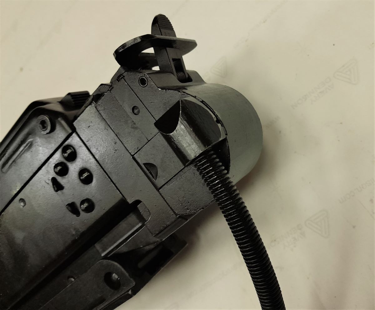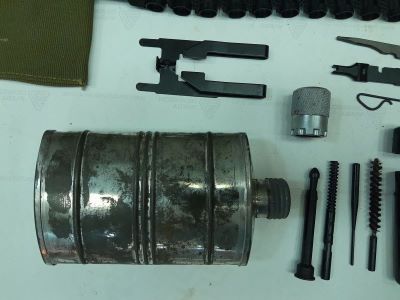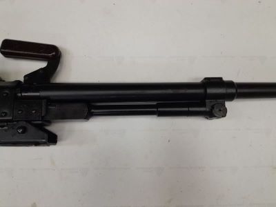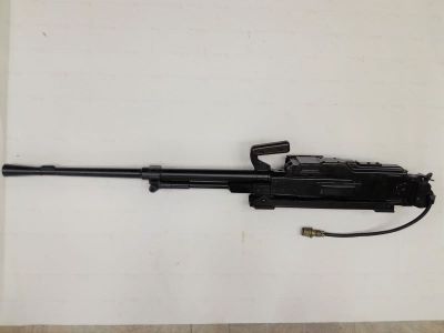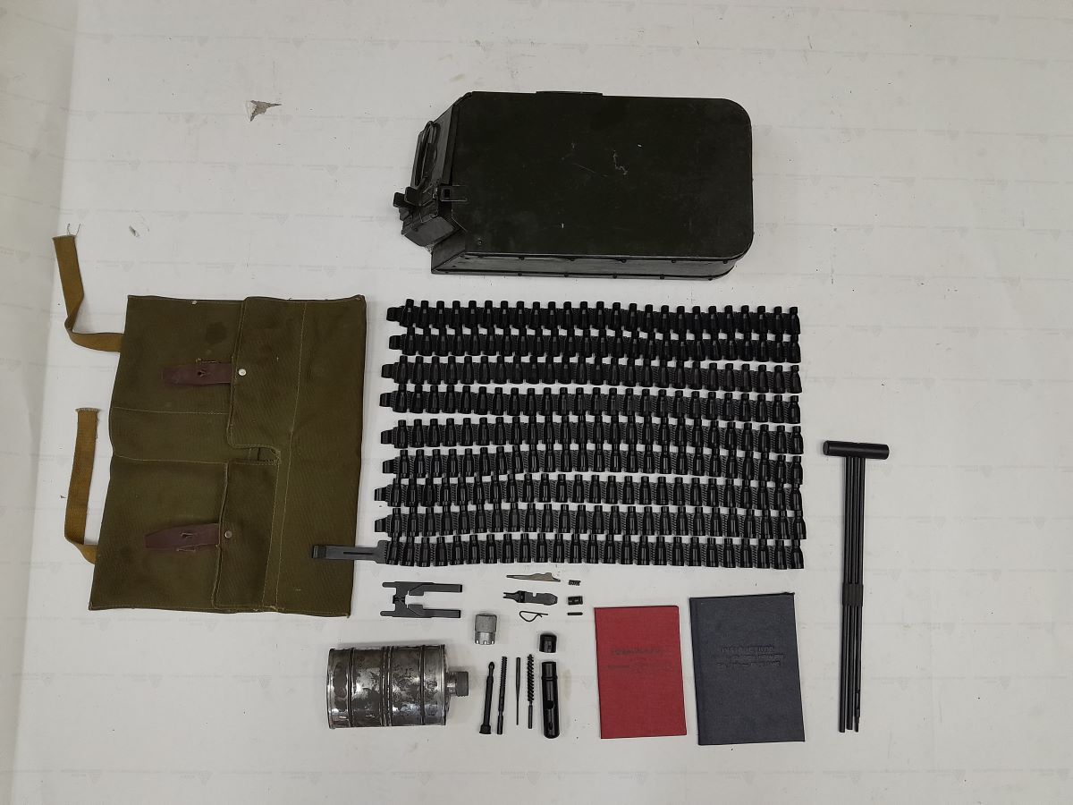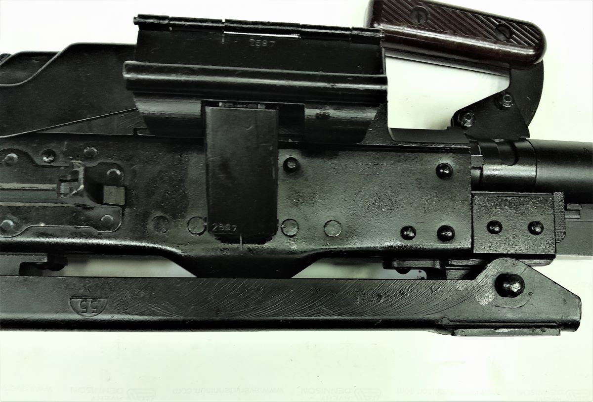 Descriere: Mitralieră „PKT”, seria „SN-2567”, calibrul 7,62x54r, fabricată în Romania, la Cugir în 1979. Arma este confecționată din oțel vopsit negru. - Cutia mecanismului este confecționată din tablă de oțel ambutisată. Pe aceasta sunt fixate prin nituire și sudare garda tragaciului, rampa de încărcare, țeava armei și țeava pistonului, patul armei. Pe partea dreaptă se află levierul selectorului de siguranță marcat „SIG” în spate și „FOC” în față. Pe partea dreaptă a cutiei mecanismului, în față, este gravată seria armei „SN-2567”. De asemenea, pe partea dreaptă a armei se află mânerul de armare. Orificiile aflate pe cutia mecanismelor pentru bandă și evacuare sunt acoperite cu capace din tablă cu arc. La parte din spate a cutiei mecanismului se află mecanismul trăgaciului electric și trăgaciul acționat manual cu siguranța acestuia, poziționate la partea superioară.Pe partea dreaptă a ansamblului trăgaciului este un capac din tablă de culoare galbenă (posibil alamă) fixat cu trei șuruburi asiguarate cu sârmă, deasupra acestuia este gravată seria armei „SN-2567”. Din acesta iese un cablu terminat cu un conector „mamă„ cu doi pini. - Capacul cutiei mecanismului pivotează în față și în interiorul acestuia este fixat ansamblul de ghidare a benzii. La partea superioară se găsesc marcajul fabricii „săgeata în triunghi”, urmat de seria armei „SN-2567” și anul de fabricație „1979”. Aceste marcaje sunt evidențiate cu alb. - Țeava este detașabilă și este marcatră la partea superioară, pe blocul de împrumut de gaze, cu seria „SN-2567”. Pe blocul de împrumut se află reglajul dimensiunii orificiului de împrumut marcat „1”, „2”, „3”, marcaje evidențiate cu roșu. Mânerul de transport este fixat printr-un colier ce pivotează în jurul țevii, plăselele acestuia sunt din material plastic. Gura țevii este filetată cu pas invers pentru accesorii. Ascunzătorul de flacără este montat la gura țevii și blocat printr-un bolț cu arc. - Mitraliera este montată pe un suport cu baza plată ce se fixează de partea inferioară a cutiei mecanismului și acesta fiind sistemul de instalare în vehiculul blindat. - Acesoriile care însoțesc arma sunt: Cartea „Formularul pentru mitraliera calibrul 7,62mm P.K.T”; cartea „Instrucțiuni privind folosirea mitralierei cal. 7,62 mm de pe tanc”; vergeaua din 3 bucăți; penarul cu următoarele accesorii: șurubelniță, dorn, cap pentru câlți, perie păr și știft spintecător; siguranță sârmă, adaptor pentru tragerea cu cartușe de manevă, întăritor de recul pentru tragerea cu cartușe de manevră, argintiu; bidon de ulei; geanta de pânză de doc kaki; extractor tuburi rupte; cutia pentru benzi din tablă de aluminiu vopsită kaki și 9 benzi pentru cartușe a câte 25 de cartușe, una cu mâner de început. Și următoarele pise de schimb: cui percutor, gheară extractoare, arcul și șplintul spintecat al acesteia. - Arma este în stare foarte bună, funcțională, fără componente lipsă sau defecte.