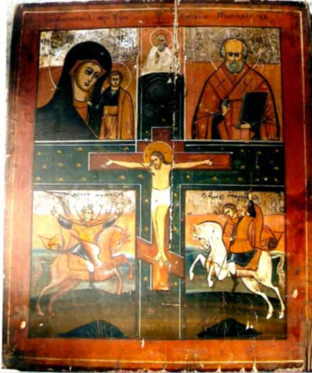 Descriere: Piesă de formă dreptunghiulară din două blaturi unite prin chingi pe spate. Icoana face parte din icoanele care se puneau pe tetrapod; se puneau în locuințe pe peretele de la răsărit. Icoana este împărțită în patru scene de mărime egală prin intermediul crucii, cu brațe egale, pe care este răstignit Iisus având desupra, pe cruce, reprezentarea lui Dumnezeu. În cele patru casete formate de cruce apar: Maica Domnului cu Pruncul, Sfântul Nicolae, Arhanghelul Mihail ca înger al Apocalipsei ținând în mâini curcubeul și cartea și Sf. Gheorghe călare. Pământurile sunt modelate cu tonuri de gri și verzui. Scena iconografică este încadrată de un chenar roșu. Fond: argintiu; motive: alb, negru, verde, ocru, grena, roșu, maron, auriu, alb, orange.