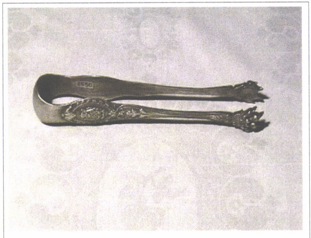 Descriere: Cleștele are un sistem de prindere sub formă de gheară. Mânerul este docorat pe ambele laturi cu stema Principatelor Unite, încadrată într-un medalion, de sub care coboară un decor floral ce se continuă până spre capătul celor două brațe de prindere. Piesa face parte dintr-un set de argintărie ce a aparținut familiei domnitoare Cuza.
