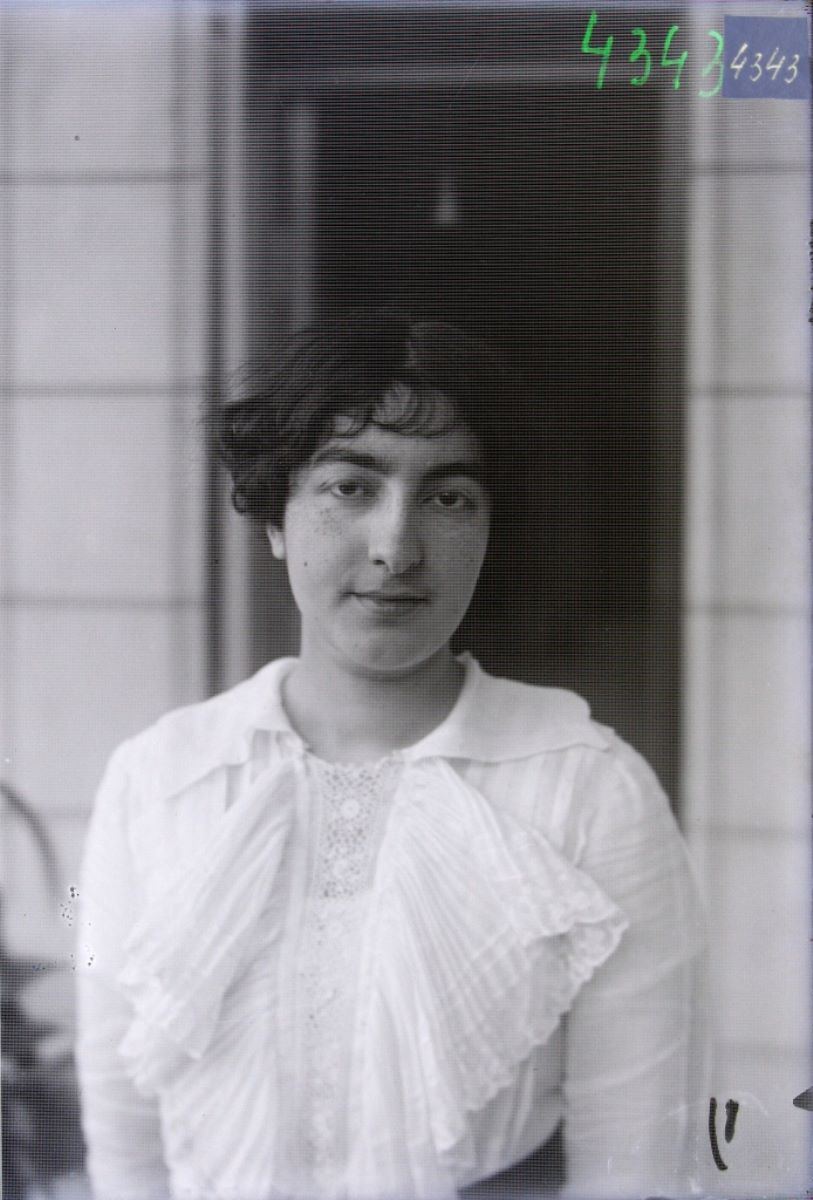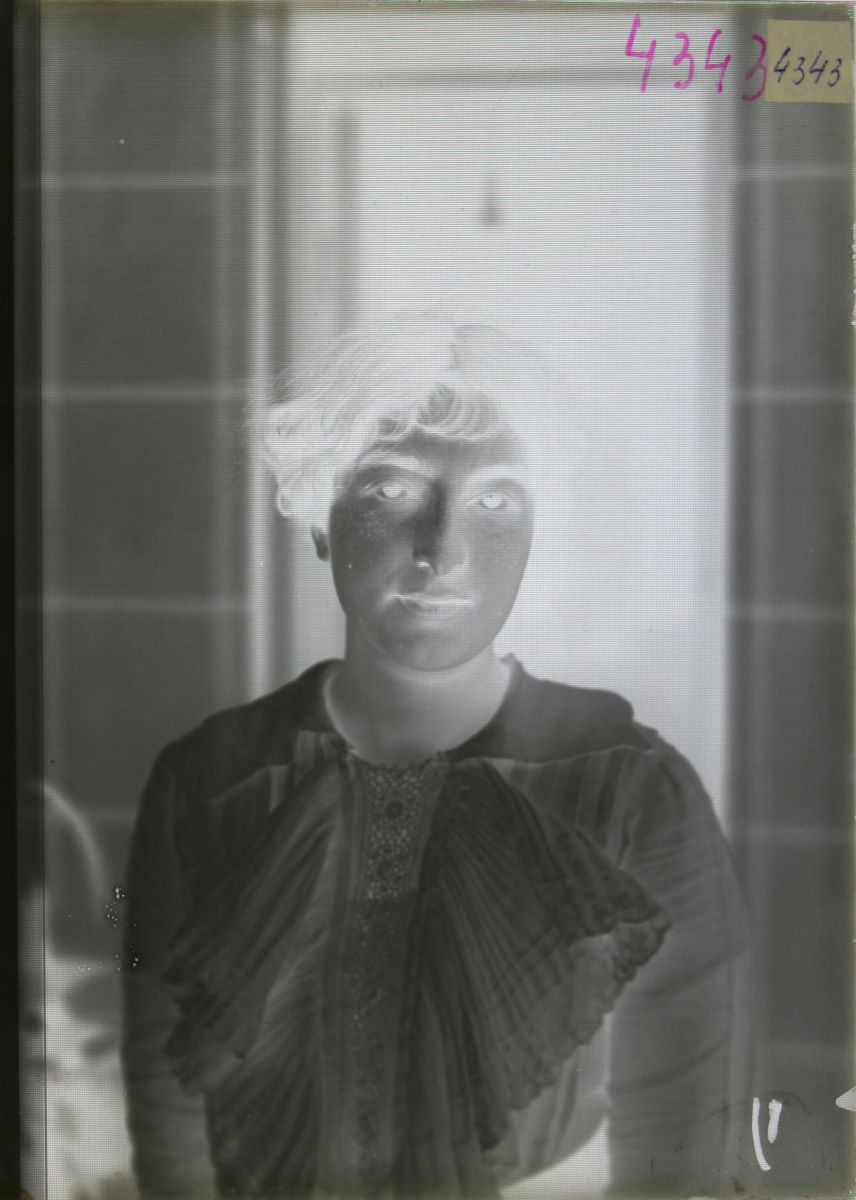 Descriere: Imagine fotografică negativă stocată pe suport de sticlă, care reprezintă un bust de femeie tânără. Persoana din imagine este îmbrăcată într-o bluză albă, cu volane, încadrată în fața unei uși. Nu este specificat autorul/atelierul fotografic. Fotografiile pe plăci de sticlă sunt imagini negative sau pozitive care au ca suport sticla, procedeele utilizate necesitând asigurarea unor condiții specifice și utilizarea unor substanțe chimice. În cazul plăcilor negative din sticlă uscată, sticla este acoperită cu o emulsie sensibilă la lumină, formată din săruri de argint, precum bromura de argint amestecată cu gelatina. Când este expusă la lumină, bromura de argint se descompune și, ca rezultat, păstrează o imagine fotografică. Sticla a fost folosită ca suport pentru fotografie de Frederick Scott Archer începând cu 1851, metoda fiind îmbunătățită în 1871 de fotograful britanic Richard Leach Maddox. Plăcile uscate sunt produse în fabrici și comercializate începând cu 1878. Stare bună de conservare.