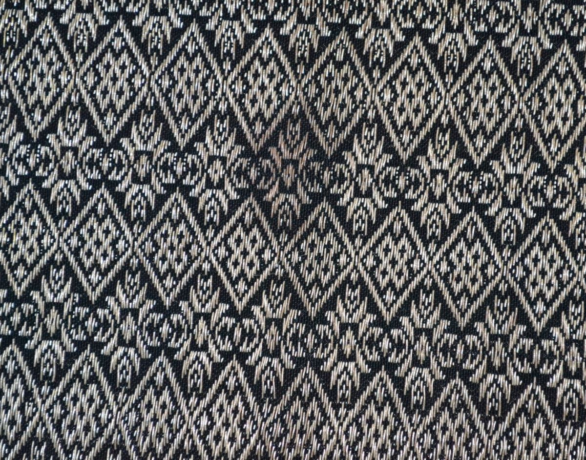 Material/Tehnică (text): bumbac, fir metalic tubular argintiu; țesut în 2 ițe, ales peste fire, aplicație