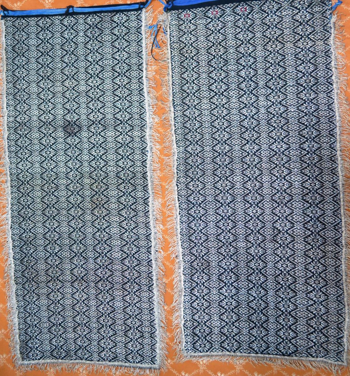 Descriere: Piesă de formă dreptunghiulară, cu decor amplasat pe toată suprafața, realizat din fir metalic tubular argintiu, ordonat în registre verticale, dispuse în alternanță decorativă, cu motive geometrice (cruce în X înscrisă în romb) și motive florale. Pe trei laturi, prezintă franjuri din fir metalic. În partea superioară prezintă o panglică aplicată. Cromatică: negru, albastru, argintiu. Șorțul are o piesă pereche ce are același decor.