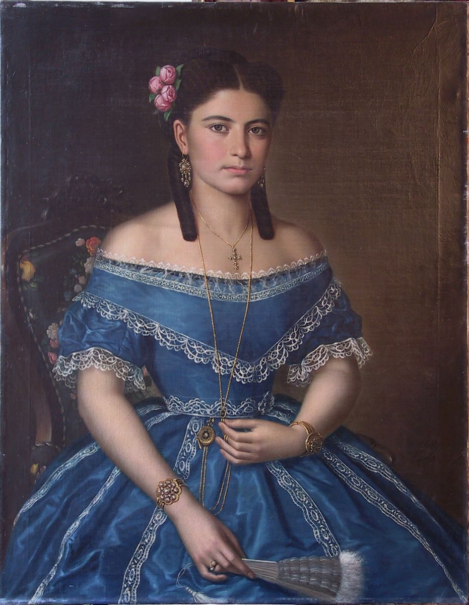 Descriere: Portret de femeie, redat 3/4 șezând, în ușor semi-profil spre dreapta. Cu o ținută care impresionează prin eleganță și bun gust, tânăra apare șezând, într-un interior sugerat doar prin fotoliul de epocă tapițat cu piele pictată. Orientată ușor spre dreapta, fata întoarce capul spre spectator, întâmpinându-l cu o privire frontală. Are chipul frumos și proaspăt, este fardată discret și pieptănată cu bucle răsucite cu fierul, după moda epocii. În păr are prins un buchețel de trandafiri specific modei Biedermeier. Carnația e redată în nuanțe delicate de ocru și roz. În mâna dreaptă ține un evantai. Eleganta rochie de mătase albastră, prin decolteul larg și mânecile scurte, îi pune în evidență frumusețea umerilor, a bustului și a brațelor. Corsetul îi accentuează finețea taliei. Cu o minuție caracteristică stilului său de esență academistă, artistul redă dantelăria aplicată pe rochie și bijuteriile (cerceii, pandantivele, brățările și inelele de aur și argint, împodobite cu pietre prețioase și perle, și ceasul prins la brâu). Calitatea și strălucirea ținutei e realizată prin nuanțările de albastru, alburi și griuri colorate, în contrast cu fundalul tern. Semnat dreapta jos spre mijloc, cu negru și datat.