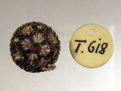 Descriere: Ac de voal pentru port popular săsesc, în formă florală, cu decor spiralat, monturi de perle mici, o sticlă roșie și petale pictate cu email.