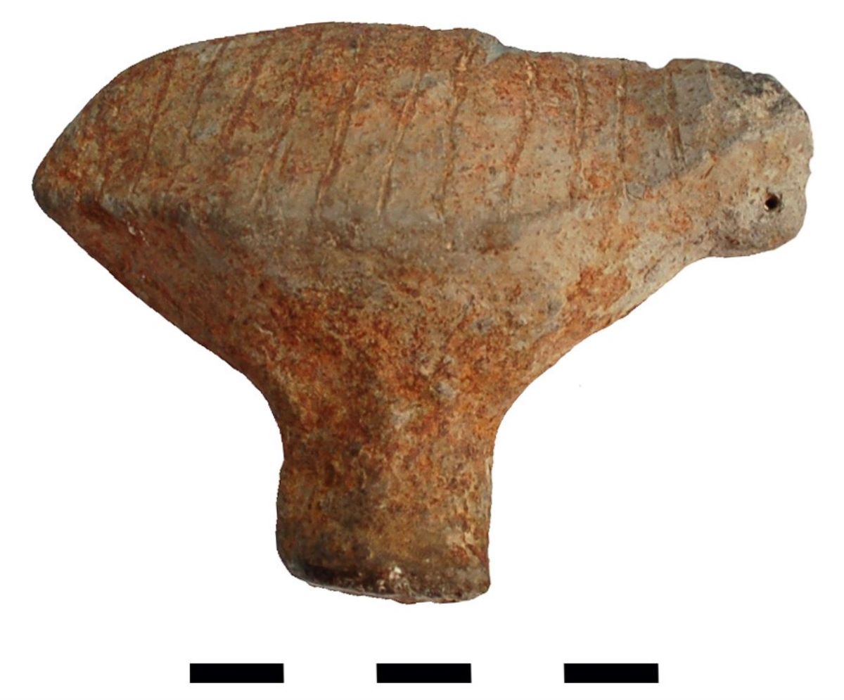 Descriere: Statuetă zoomorfă reprezentând o pasăre cu aripile deschise. Capul parțial deteriorat are partea inferioară rotunjită străpunsă de o perforație laterală. Corpul este așezat pe un piedestal cilindric. Aripile sunt decorate prin incizii umplute cu pastă albă. Întreaga statuetă a fost acoperită cu vopsea de culoare roșie. Interiorul corpului este gol iar radiografia piesei a pus în evidență o concavitate în care se află șase biluțe circulare, modelate din lut. Piesa face parte din categoria așa-numitelor zornăitori. Pastă fină de culoare galben cărămiziu.