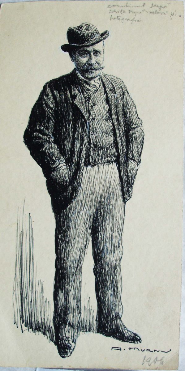 Descriere: Portretul lui I.L.Caragiale, cu care Murnu era în relații de amiciție, realizat după schița după natură și o fotografie. Portret de bărbat figurat în picioare, privit frontal, ușor răsucit spre dreapta. Poartă pălărie moale cu boruri, mustață groasă răsucită în sus, surtuc, veston pantaloni uni. Ține ambele mâini înfundate în buzunare. Desen cu duct precis, incisiv și continuu, cu hașuri fine și elaborate în sugerarea zonelor de umbră și lumină.