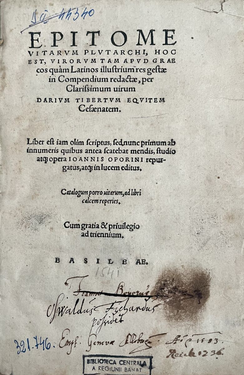 Descriere: Epitome vitarum Plutarchi, hoc est, virorum tam apud Graecos quam Latinos illustrium res gestae in Compendium redactae / per Clarissimum virum Darium Tibertum equitem Cesaenatem : Liber est iam olim scriptus, sed nunc primum ab innumeris quibus antea scatebat mendis, studio atque opera Ioannis Oporini repurgatus, atque in lucem editus : Catalogum porro vitarum, ad libri calcem reperies. Cum gratia & privilegio ad triennium. Basileae
