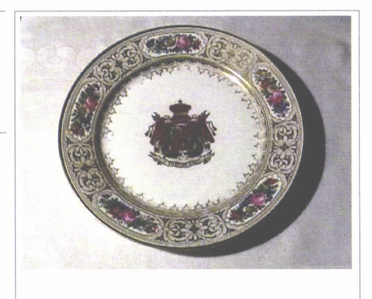 Descriere: Farfuria face parte dintr-un serviciu de masă compus din peste 100 de piese comandate la manufacturile regale din Sèvres de către familia domnitoare Cuza. Serviciul urma să fie folosit în palatul domnesc din Cotroceni. Farfuria este întinsă, circulară și pictată pe margini cu cinci medalioane florale care alternează cu arabescuri aurii. Reprezintă modelul decorativ în stil Louis-Philippe, creat în anul 1844 de către ceramistul Charles Antoine Didier, fiul. Farfuria este decorată central cu stema Principatelor Unite și deviza unionistă „Toți pentru Unu”. Stema și motivele florale se caracterizează printr-o vie policromie: galben, nuanțe de roșu, roz, verde și albastru. Pe reversul ei apar două mărci în câmp circular, „Chateaux de Trianon” (culoare roșu-carmin) și „Sevres 1846” (cu albastru). De asemenea se remarcă cartelul care conține, în cifre latine, datele dublei alegeri ale lui Alexandru Ioan Cuza ca principe al Țării Românești.
