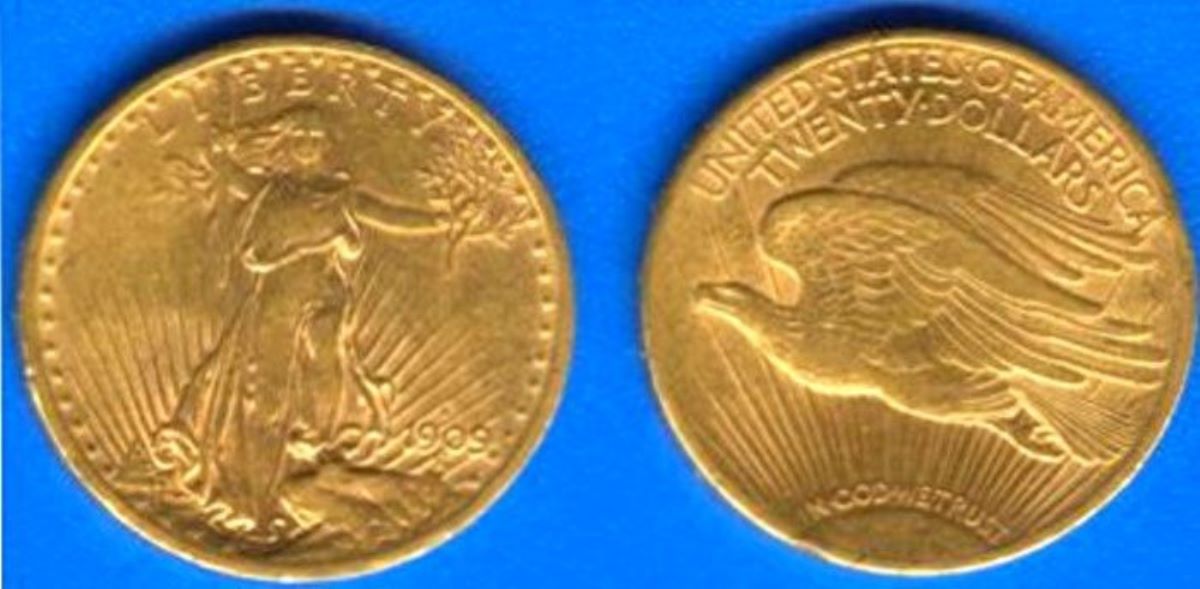 Descriere avers: Tânără despletită cu părul în vânt, uitându-se spre privitor, ține în mâna dreaptă o torță aprinsă (simbolul libertății) și în mâna stângă o ramură de măslin. În spatele ei sunt reprezentate razele soarelui. În dreptul piciorului drept apare clădirea Capitoliului iar în dreptul piciorului stâng ce se sprijină pe o stâncă ce are în față un ram de stejar, millesimul cu cifre arabe 1908. Dedesubt, numele machetatorului monogramat AG (August Saint Gaudens). Imaginea este înconjurată de un cerc format din 48 de stele cu 6 colțuri.