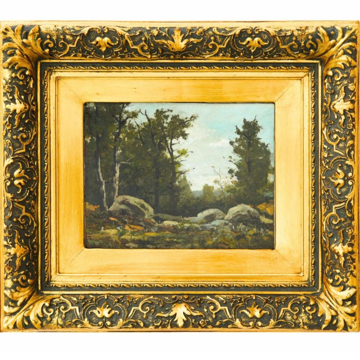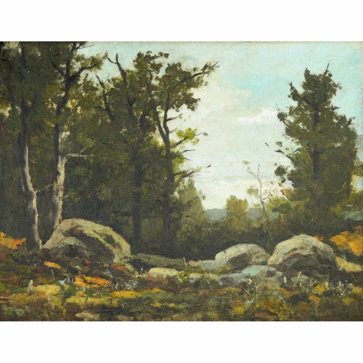 Descriere: Imaginea prezintă o poiană împădurită. În prim-plan câteva stânci mari, rotunjite, așezate pe un sol acoperit cu iarbă și frunziș. În fundal se ridică arbori înalți, cu trunchiuri subțiri și coroane bogate, printre care se poate distinge cerul cu câțiva nori. Semnat dreapta jos: I.Andreescu; pe verso însemnare olografă a lui J.Al. Steriadi.