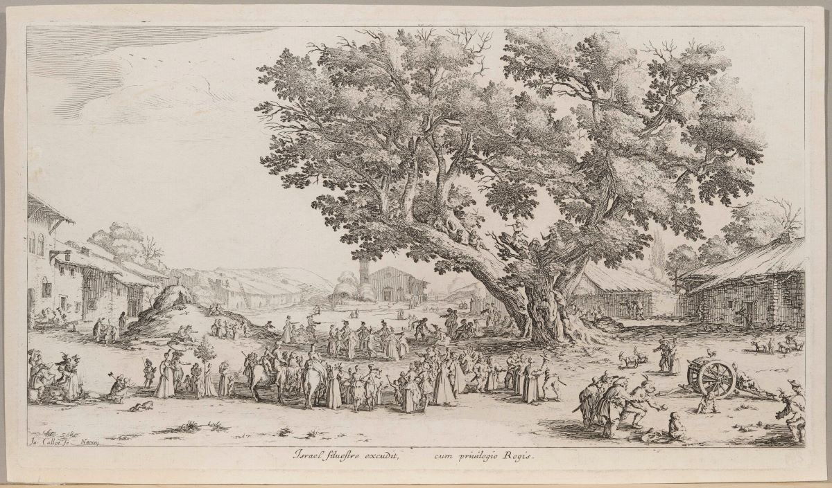 Descriere: Gravură realizată după 1625, odată cu revenirea artistului din Italia. Gondreville era locul de vacanță al episcopului de Toul, din dioceza de Nancy, protector al lui Callot. Totodată se pare că această piesă purta numele, după decesul artistului, de „satul Xeulley”, unde avea o proprietate. Compoziție amplă cu vedere spre piața unde se ține o serbare câmpenească. În centru, un copac uriaș în care sunt suiți muzicanții. La poalele arborelui țăranii dansează în cerc, înconjurați de privitori în diverse atitudini, între care unii călări. În stânga, un grup de tinere oferă unei perechi de nobili un maial în cinstea primăverii; în dreapta un grup de patru bărbați joacă bile. Gravură lucrată cu un ac alert și egal, cu detalii miniaturale într-un perfect echilibru. Repartizare judicioasă a zonelor de umbră și lumină. Placa de aramă se păstrează la Muzeul de Artă din Nancy. Inscripții gravate mijloc jos în cuvetă: Israel Siluestre excudit, cum privilegio Regis. Semnat și localizat gravat stânga jos în cadru: Ja. Callot fe. Nanceij; Verso însemnări în creion cu locul în colecția Cantacuzino: 297/IV/ Callot. 4e et. /Meaume 623.