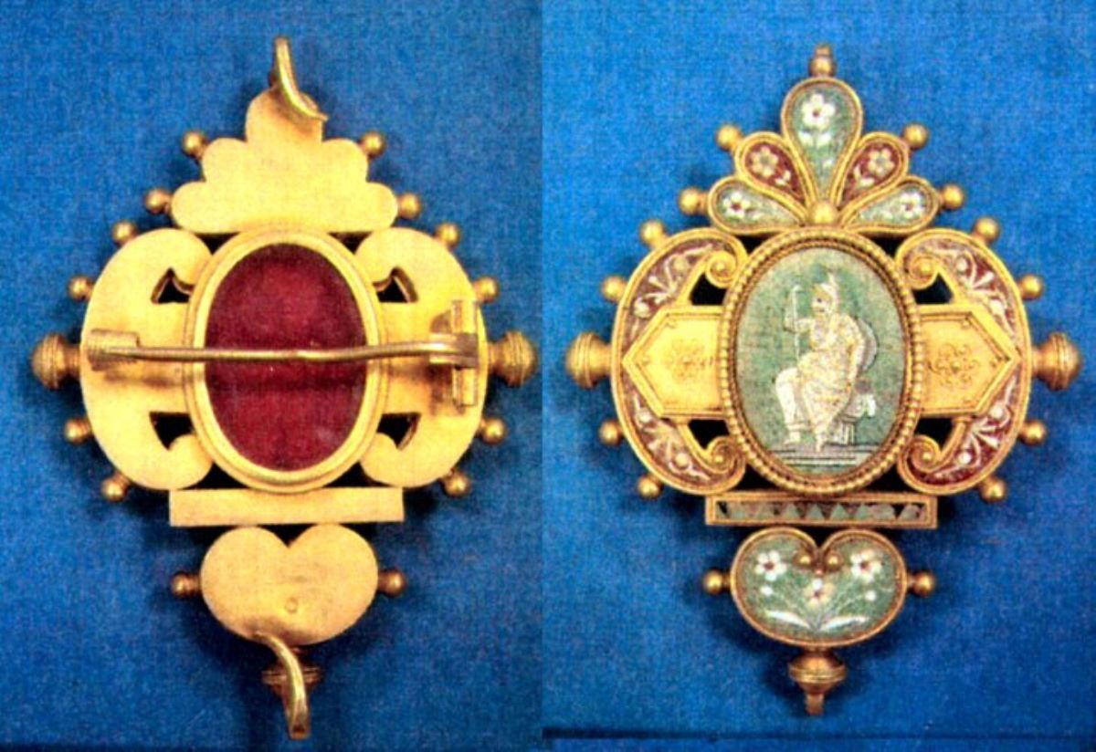 Descriere: Broșă cu agrafă de prindere și cheiță de siguranță sudată pe mijlocul reversului dar și cu două cârlige în partea superioară și inferioară. Piesa se compune dintr-o placă centrală de formă ovală, cu chenar dublu granulat. Câmpul central ornamentat în tehnica mozaic, cu pietre semiprețioase, albe pentru figura centrală și verzi pentru fond, prezintă un personaj masculin în costum antic stând pe tron (zeitate?), redat în profil, ținând în mâna dreaptă un toiag; în partea superioară a plăcii a fost sudată o placă polilobată cu 5 butoni și chenar filigranat, ornamentată în aceeași tehnică, cu motive florale: 3 flori albe pe fond verde și două pe fond roșu. Pe laturile plăcii centrale, au fost sudate două plăci semilunare și două pentagonale, care suprapun parțial pe cele semilunare. Plăcile pentagonale, cu chenar filigranat și granule în colțuri, au în centru un motiv floral filigranat-granulat. Plăcile semilunare cu chenar filigranat, sunt prevăzute cu patru butoni mai mici și unul mare central, decorat cu două inele filigranate, au un ornament vegetal mozaicat: flori de crin albe pe fond roșu. În partea inferioară a plăcii centrale, a fost sudată o placă dreptunghiulară îngustă cu chenar filigranat decorată cu 9 triunghiuri de culoare verde închis, pe fond verde deschis. De aceasta a fost sudată o placă cordiformă cu chenar filigranat preăzută cu trei butoni exteriori, cel central (de jos) mai mare și cu două inele filigranate. Câmpul central este decorat cu un motiv floral: trei flori albe într-un câmp verde, despărțite de trei granule sudate (două mari și una mai mică).