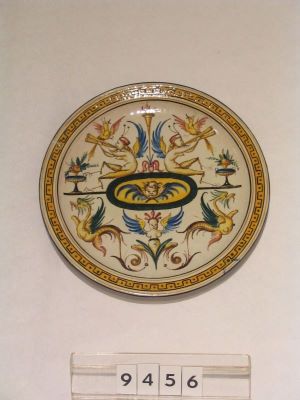 Descriere: Farfurie decorativă, circulară, pictată manual cu decor plin, motive grotești, obținute cu o paletă tipică de galben deschis și transparent, tonuri de albastru închis și verde în tonuri clare. Motivele grotești desenate cu aceste culori sunt pe fond alb. Genul acestei ceramici este Urbino.