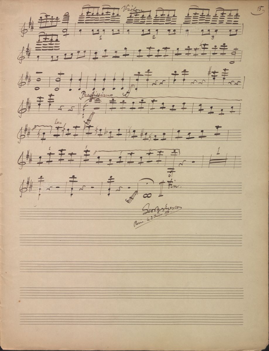 Descriere: Manuscrisul reprezintă știma Sonatei pentru pian și vioară nr. 1 op. 2 de George Enescu și cuprinde 8 file completate față/verso, exceptând ultima filă care este completată doar față. Documentul include o pagină de titlu și 15 pagini de text muzical propriu-zis numerotate de compozitor de la 2 la 15, în care se desfășoară cele 3 părți ale lucrării. Pagina de titlu prezintă în partea de sus dedicația „À Monsieur J. Hellmesberger de Vienne”, în centrul paginii este notat titlul lucrării, iar mai jos semnătura compozitorului și indicația „Violon”. La pagina nr. 2 sunt notate din nou titlul lucrării, semnătura compozitorului și „Violon”. Indicația de tempo a primei părți, Allegro vivo (pătrimea = 176), precede cele 57 de măsuri cuprinse în această primă pagină de partitură muzicală. Prima parte se desfășoară de la pagina 2 la pagina 6, a II-a parte – Adagio (optimea = 40) - paginile 7-9, a III-a parte – Allegro – paginile 10-15. La pagina 11 sunt scrise doar 5 portative, ultimele 7 portative ale paginii fiind neclompletate. Fiecare parte prezintă la început, în partea de sus, indicația „Violon”, care sugerează că este vorba despre știma lucrării.