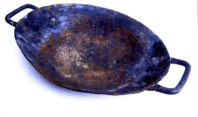 Material/Tehnică (text): trocul este confecționat din tablă prin forjare și nituire