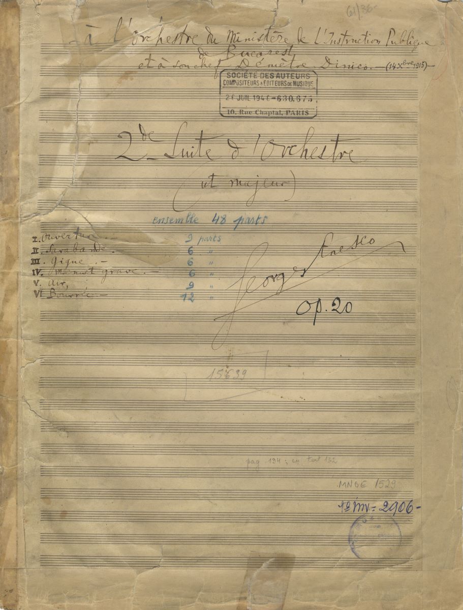 Descriere: Manuscris muzical autograf complet, intitulat ”2de Suite d'orchestre (ut majeur) op. 20” (Suita a II-a pentru orchestră în Do major, op.20), partitură generală. Manuscrisul este alcătuit din 133 pagini completate față-verso cu cerneală neagră. Paginile sunt numerotate de autor de la 1-132. Pagina de titlu conține următoarele: O dedicație în limba franceză și datare: „À l'Orchéstre du Ministère de l'Instruction Publique de Bucarest et à son chef, Démètre Dinico, 14 Xbre 1915” (”Orchestrei Ministerului Instrucțiunii Publice și dirijorului ei, Dimitrie Dinicu, 14 decembrie 1915”), în partea de sus, central. Ștampila ”Societății Autorilor, Compozitorilor și Editorilor de Muzică”, în partea de sus, central, sub dedicație. Titlul compoziției: ”2de Suite d'orchestre (ut majeur)”, în partea de sus, central. Titlurile părților componente: I. Ouverture, II. Sarabande, III. Gigue, IV. Menuet grave, V. Air, VI. Bouré – în partea din stânga, central. Mențiunea ”Ensemble 48 parts. 9/6/6/6/9/12 parts”, cu creion albastru (nr. de știme). Semnătura compozitorului și nr. de opus al compoziției: ”Georges Enesco, op. 20”, central-dreapta. Nr. vechi de inventar și cel nou – în colțul dreapta-jos. Manuscrisul este alcătuit din 6 părți, astfel: I. Ouverture, Allegro ben moderato, pp. 1-28; II. Sarabande, Moderato sostenuto, pp. 29-42; III. Gigue, Vivace, ma non troppo, pp. 43-47; IV. Menuet grave, Ben moderato, pp. 48-52; V. Air, Andante mesto, pp. 53-63; VI. Bouré, Tempo di Bourée, pp. 64-132. Semnătura compozitorului apare pe pagina de titlu, central-dreapta și pe paginile cu nr. 1, 28, 42, 47, 52, 63,132, colțurile dreapta-jos. Reperele muzicale sunt notate cu creion albastru, încercuite. Manuscrisul prezintă numeroase însemnări cu creionul. Pe alocuri sunt și notații cu creion roșu.