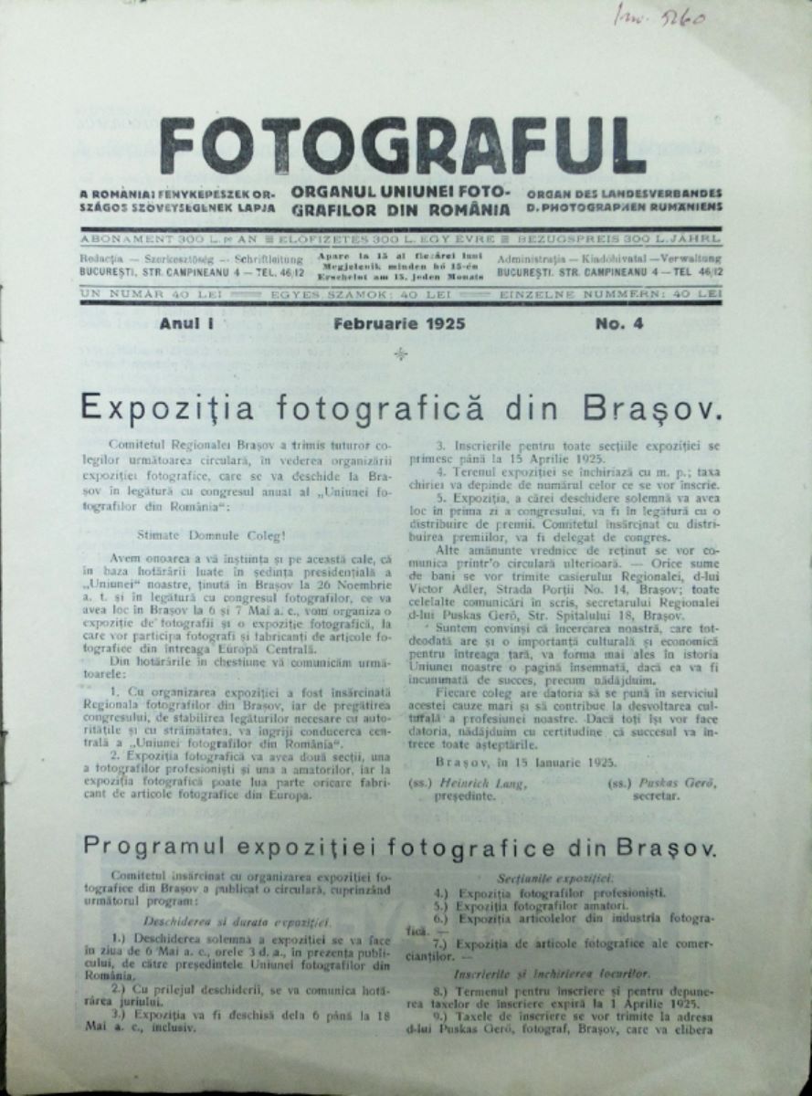 Descriere: Revistă ”Fotograful” este o publicație de specialitate redactată trilingv (română, germană și maghiară) de Uniunea Fotografilor din România, cu sediul în București, strada Câmpineanu nr.4. Pe coperta exterioară sunt imprimate: titlul revistei cu caractere grafice mari plasate într-un chenar cu motive geometrice stilizate, prețul exemplarului de 40 lei, redacția și sediul, reclama la reprezentanța generală a produselor AGFA din București. Prezentul număr 4 din luna februarie 1925 are 8 file, text redactat pe două coloane și prezintă cititorului articole destinate tuturor celor interesați de fotografie și evenimentele fotografice ce urmau a fi desfășurate la nivel național pe parcursul anului 1925. Din cuprinsul revistei atrag atenția cititorului două articole: ”Expoziția fotografică de la Brașov” ce urma a fi organizată în perioada 6-7 mai, 1925, în care este prezentat programul acesteia; al doilea articol intitulat ”Scene de stradă din orașele mari” sunt prezentate pentru fotografi o serie de îndrumări privind maniera de imortalizare a scenelor stradale. Paginele 2, 3 și 4 ale copertelor sunt dedicate reclamelor de tehnică fotografică. Prezentul exemplar conține coperte din hârtie obișnuită, bicolor, tipărit elegant și cu inserări de reclame. Revista are importanță cultural-documentară privind viața fotografică din România perioadei interbelice.