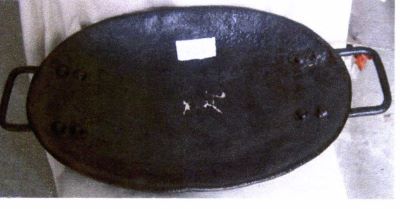 Material/Tehnică (text): trocul este confecționat din tablă de oțel prin forjare și nituire