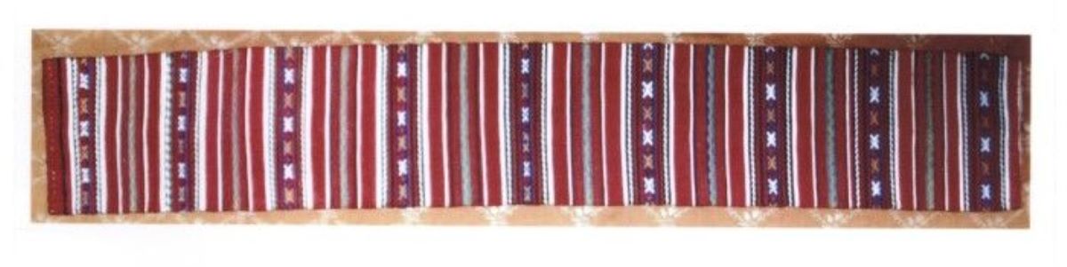 Descriere: Formă dreptunghiulară, decor amplasat pe toată suprafața, format din motive geometrice sub formă de grupuri de vergi de diferite lățimi în alternanță cromatică și decorativă sub formă de registre cu motivele: romb, cruce în X, punct, val, dispuse transversal. Cromatică: alb, roșu, albastru, verde, portocaliu, negru.
