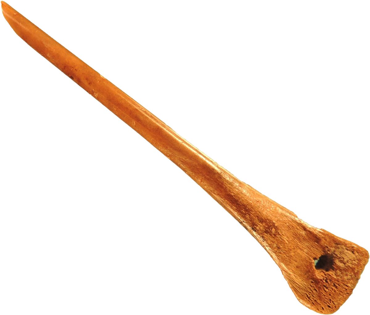 Descriere: Fibula de porc. Culoare brun-deschis. Formă alungită neregulată, margini și extremitate proximală de aspect neregulat, sinuos (de debitaj). Debitaj prin despicare, cioplire, fracturare. Fasonare (amenajarea părții active) prin abraziune. Perforare la partea proximală pentru fixarea firului de coasere; perforație circular, realizată bilateral prin rotație. Urme de utilizare: fracturi, tocire, lustru. Utilizare probabilă (ocupații): prelucrare/asamblare piei și materiale textile, împletit, perforat.