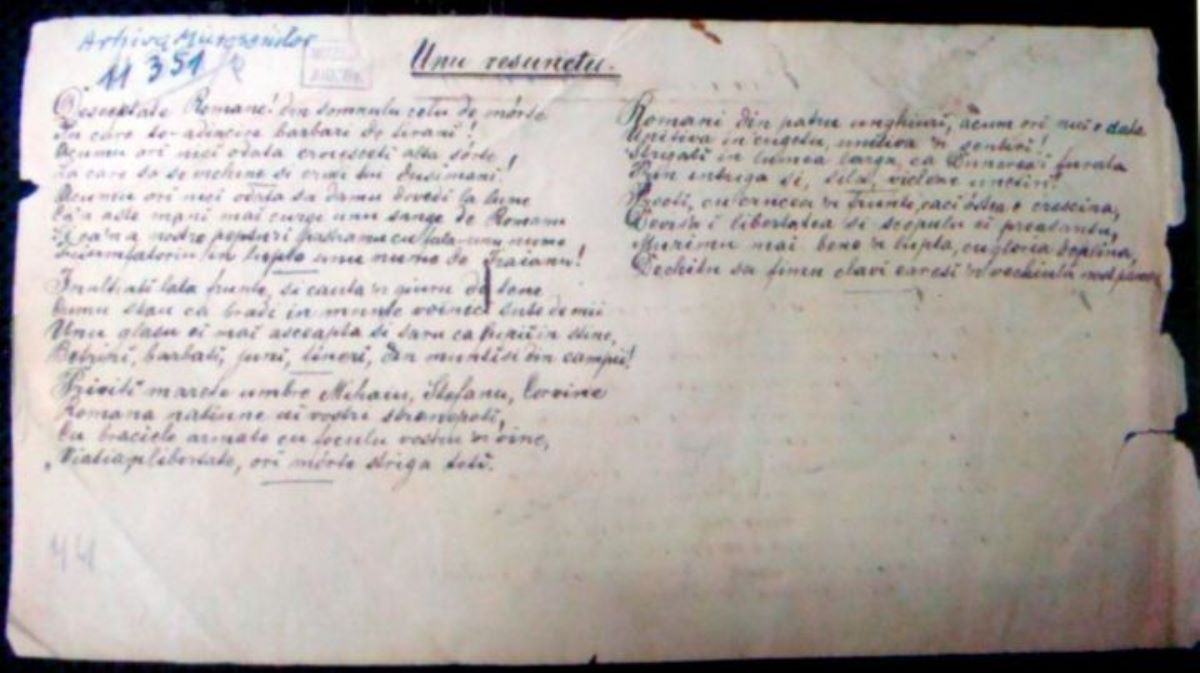 Descriere: O filă manuscris cu cerneală neagră, care conține câte o poezie a lui Andrei Mureșanu pe fiecare față. Pe fața manuscrisului este poezia "Un răsunet", care cuprinde doar 6 strofe. Pe verso este transcrisă poezia "Emanciparea Țiganilor" care cuprinde 4 strofe. Poezia "Un răsunet", cunoscută astăzi sub titlul "Deșteaptă-te române", Imnul de Stat al României, a fost scrisă în primăvara anului 1848 și publicată în "Foaie pentru minte, inimă și literatură" în 25 iunie 1848. Poezia a circulat în epocă în formă manuscrisă fiind cântată de elevii lui Andrei Mureșanu de la gimnaziul romano-catolic din Cetatea Brașovului. După aspectul scrisului și al ortografiei documentul poate fi datat la mijlocul sec. al XIX-lea, fiind foarte valoros prin prezența sa în cadrul Arhivei Mureșenilor. În colțul din stânga sus (pe față) se află ștampila dreptunghiulară, albastră, a Muzeului județean Brașov, și inscripția cu cerneală albastră "Arhiva Mureșenilor 11351".
