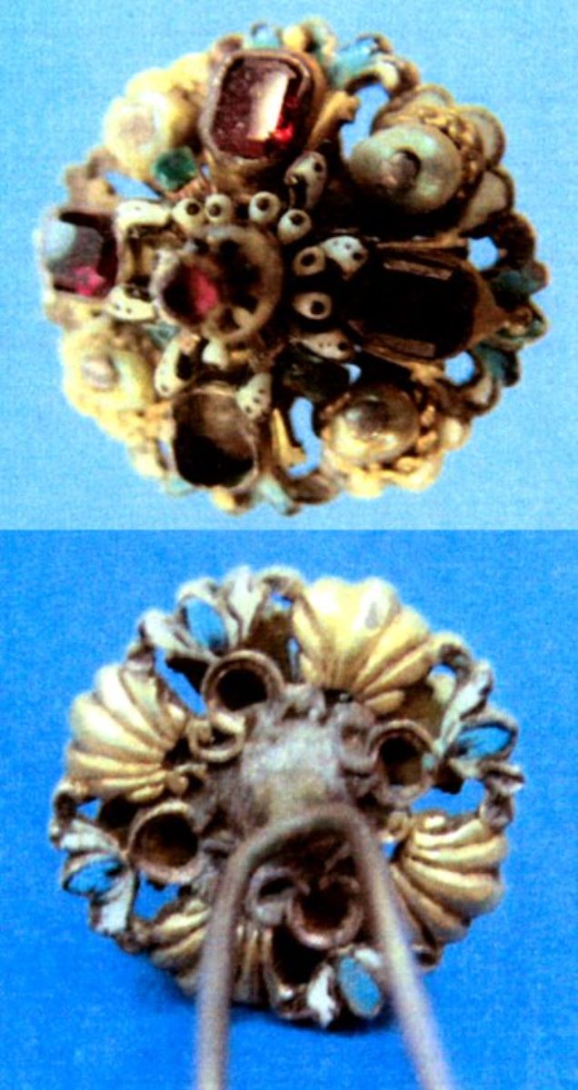 Descriere: Piesa a: ac de păr cu montură dublă: aversul ornamentat cu casete, în care au fost încastrate pietre semiprețioase: 5 almandine (una lipsă) în casete ovale și 4 perle baroc, fixate cu nit de argint aurit, în jurul cărora se află un chenar din sârmă de argint răsucită. În centru, o altă perlă baroc, în jurul căreia sunt dispuse granule mai mici decorate cu email alb, iar în vârful perlei se află un almandin mai mic. Reversul este o ramă ajurată, cu motiv floral, decorat cu email alb și albastru. Acul este dublu și este sudat pe ramă.