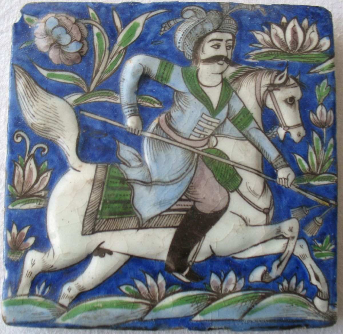 Descriere: Pe fond albastru cobalt, într-un peisaj cu flori, un călăreț cu veșmânt albastru deschis și guler verde, ținând cu ambele mâini o suliță, al cărei vârf nu este reprezentat pe această placă.