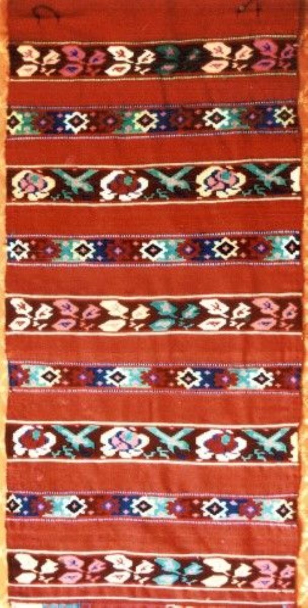 Descriere: Formă dreptunghiulară, decor amplasat pe toată suprafața, ordonat în registre sub formă de vergi mai late cu motive florale stilizate și fitomorfe, dar și motive geometrice (romb, cruce, triunghi) în registre mai înguste, în alternanță cu vergi roșii dispuse orizontal și paralel. Cromatică: alb, roșu, albastru, verde, galben, negru.