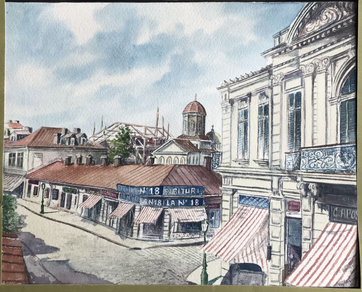 Descriere: Vedere în perspectivă spre biserica Doamnei și seria de prăvălii dinspre fosta Cale a Mogoșoaiei. În dreapta, în prim-plan un fragment din fostul Han Dedu, închiriat la 1849 de comerciantul german Karl Knappe. În plan secund prăvălii scunde și imaginea bisericii Doamnei privită dinspre vest. Acuarelă ce prezintă detalii arhitectonice atent descrise, dar și efecte de luminozitate și transparență în laviu.