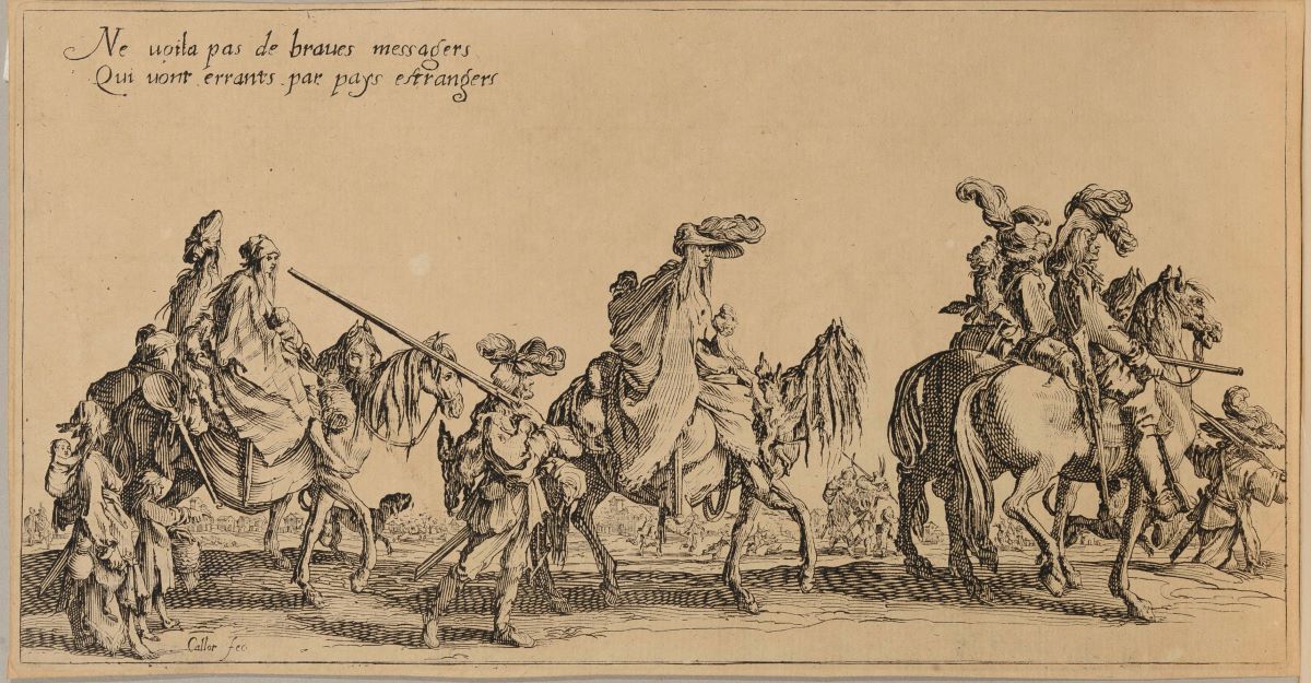 Descriere: Probabil planșa a doua din serie. Compoziție cu procesiune de țigani în prim-plan, în mers, de la stânga spre dreapta. Cortegiul este condus de o pereche călare, bărbatul ține în mană un baston și o flinta la șa, la mijloc o femeie călare, probabil o regină, duce doi copii în față și la spate. Lângă ea pe jos un bărbat cu muscheta pe umăr. Convoiul este încheiat de o altă pereche călare, cu copii aburcați în fața și în spatele calului precum și o femeie pe jos, cu un copil în spate și un altul de mână. Diferențele față de exemplare originale sunt vizibile la câinele care îi însoțește, la detaliile piciorului soldatului din prim-plan, la detaliile copiilor aburcați în spate pe cai sau coama calului reginei. Inscripție stânga sus: Ne uoila pas de braves messagers / Qui uont errants par pays estrangers. (Priviți acești bravi mesageri / Care rătăcesc prin țări străine). Semnat stânga jos: Callot fec.