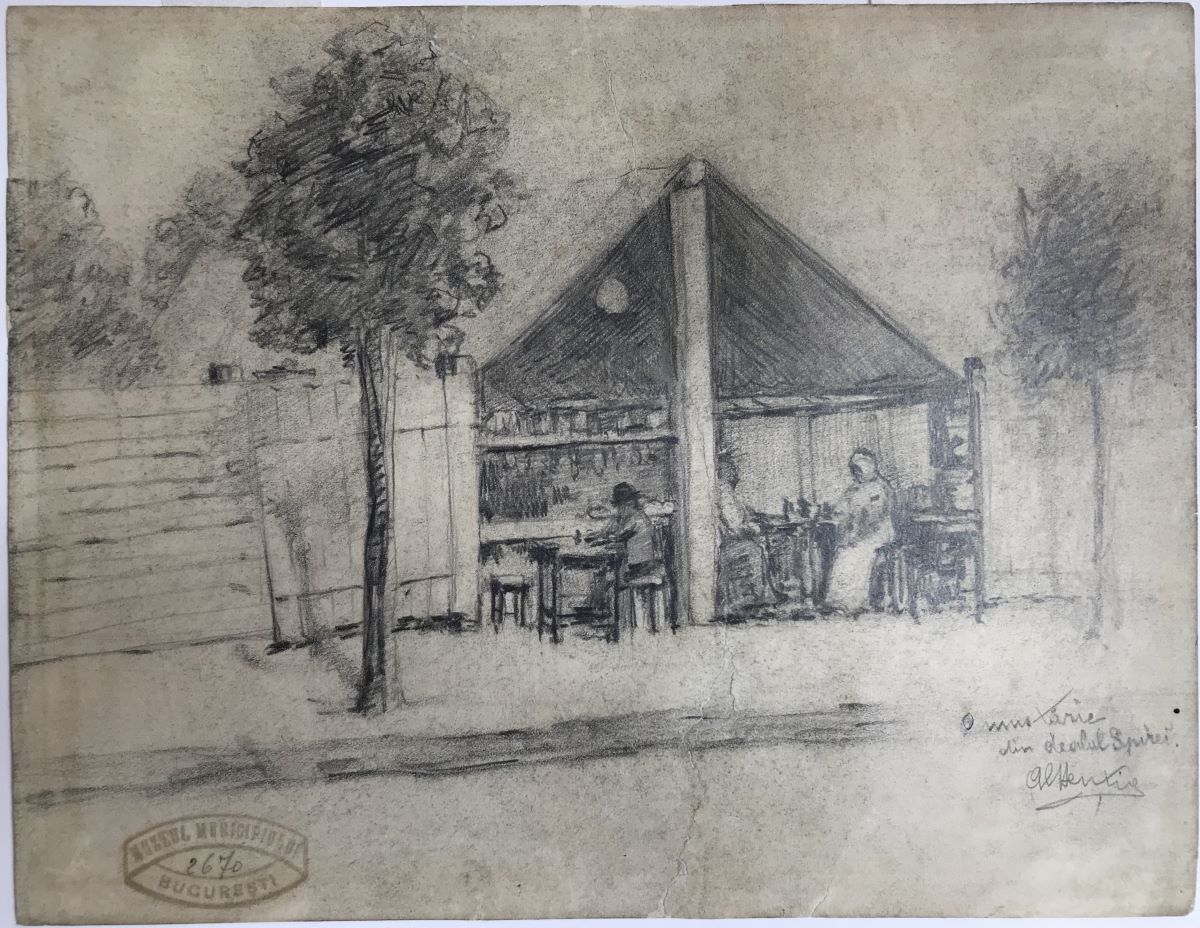 Descriere: Vedere a unei ulițe, cu un gard în stânga și doi copaci firavi. La centrul imaginii o baracă deschisă spre stradă. În interior mușterii așezati la mese. Desen cu detalii succinte, cu stilizări viguroase și estompări ce creează efect de atmosferă.