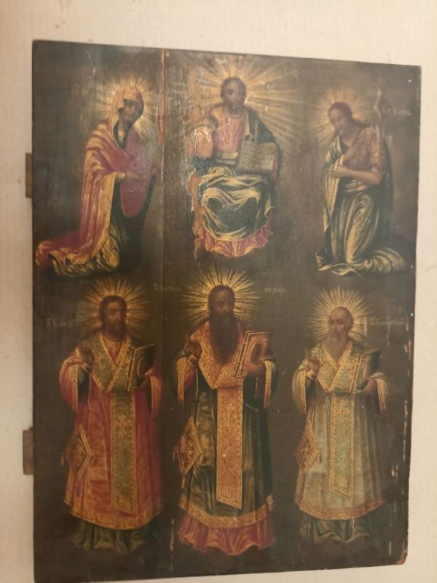 Descriere: Compoziția este foarte greu de încadrat tematic, ilustrând de fapt două subiecte distincte: Deisis, în partea superioară, și figurile celor trei mari ierarhi autori de liturghii, în partea inferioară. Fizionomiile sunt foarte bine individualizate, veșmintele se remarcă prin finețea detaliilor decorative - la personajele din registrul inferior, și prin corectitudinea cu care urmează anatomia - la personajele din registrul superior.