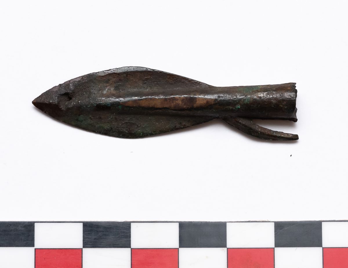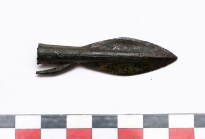 Descriere: Vârf de săgeată din bronz, cu lama sub forma unei frunze de salcie (două muchii) și nervură mediană, prevăzut cu tub de înmănușare lung de care este atașat un spin ușor arcuit.