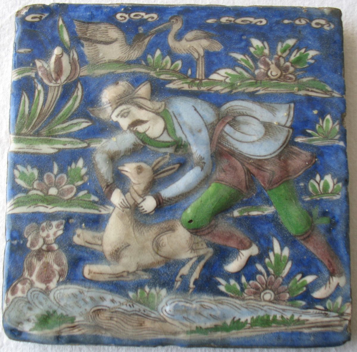 Descriere: Pe fond albastru cobalt, într-un peisaj cu flori mari, un personaj cu musață, purtând pantaloni verzi, văzut din profil stânga, cu un cuțit în mâna stângă, stă aplecat deasupra unei căprioare, pe care o imobilizează. În colțul din stânga jos, în fața căprioarei, este reprezentat un câine. În partea de sus, două păsări. Pe verso, cu negru, caracter arab pentru cifra 3 (٣).