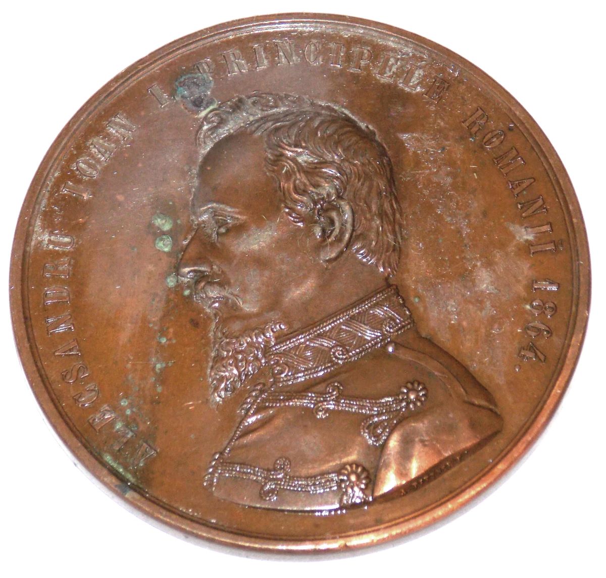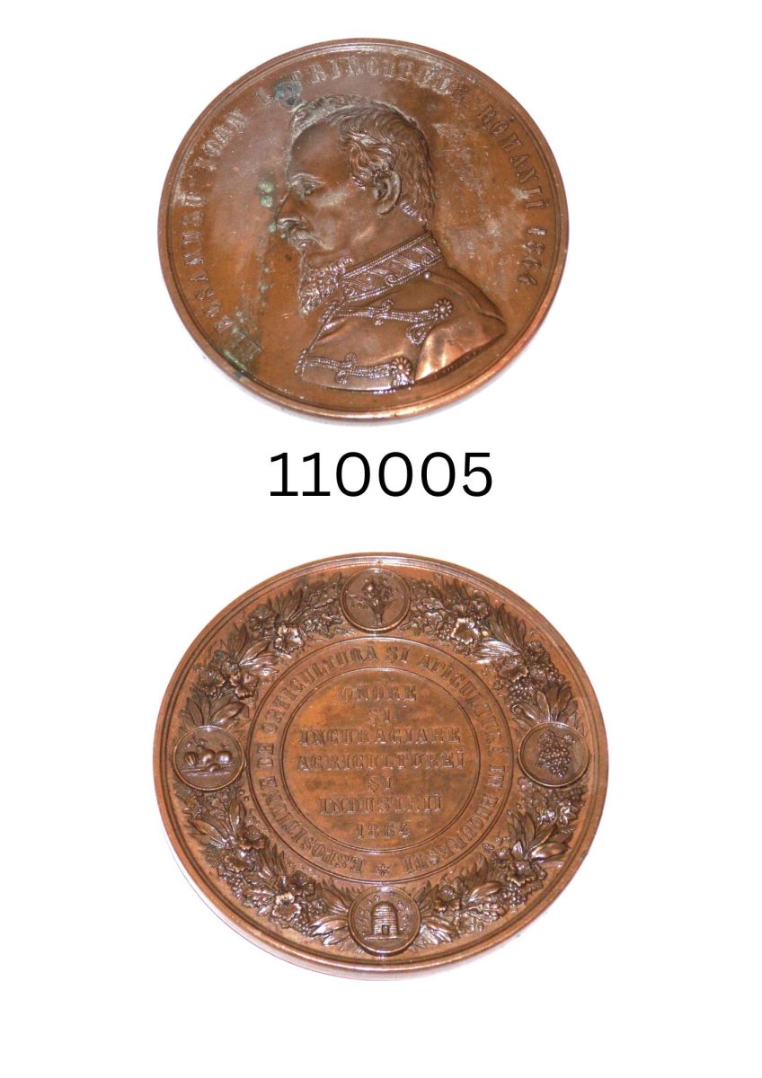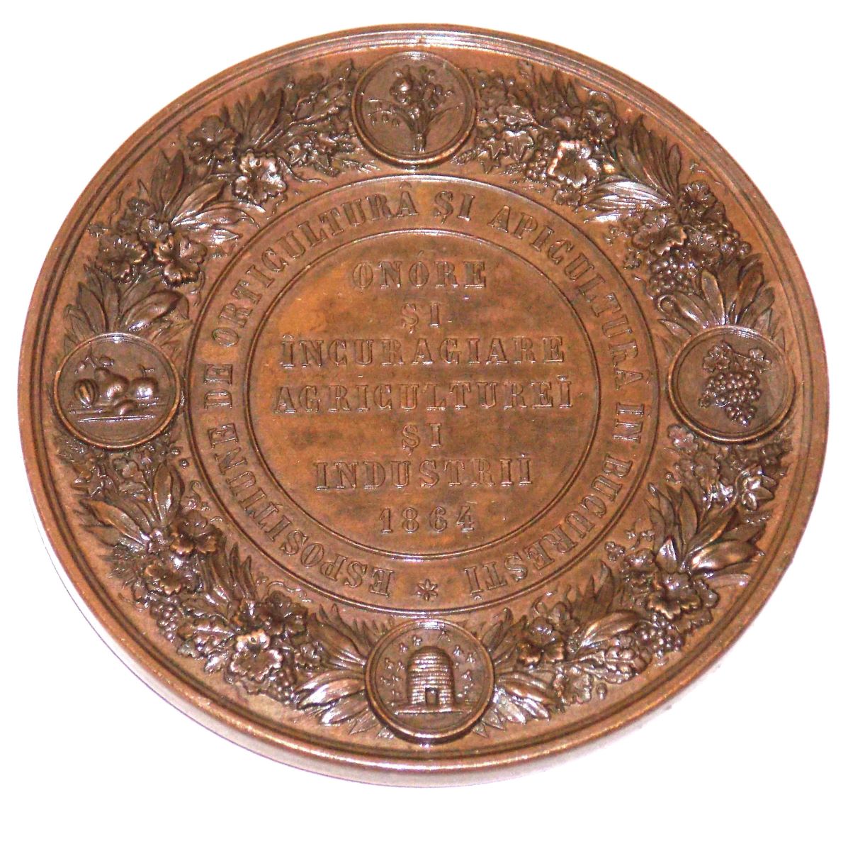 Legendă revers: ONORE/SI/INCURAGIARE/AGRICULTUREI/ SI/ INDUSTRII/ 1864; in jur intre doua cercuri liniare: ESPOSITIUNE DE ORTICULTURA SI APICULTURA IN BUCURESTI