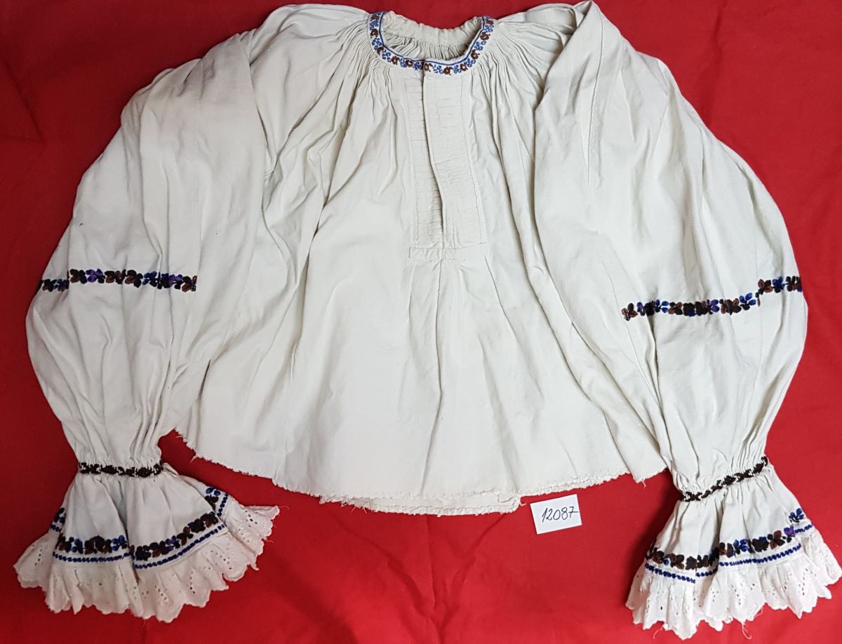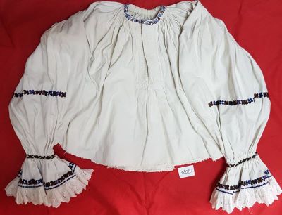 Descriere: Cămașă femeiască confecționată din pânză de casă, țesută în 2 ițe. Gura în față, încrețită la gât, cămașa este prevăzută cu un guler îngust, aplicat, brodat cu motive florale stilizate. De-o parte și alta a gurii este încrețită în pliuri, dispuse pe orizontal. Mâneca largă pornește de la gât, cu o bucată de pânză (platcă) la subsoară. Deasupra fodorului mâneca este prinsă în creț; mâneca se termină cu fodor (volan) încrețit, mărginit cu dantelă cumpărată. Decorul brodat se reduce la motivele dispuse pe guler, la șirele peste cot și cele de la fodor. Cromatica: albastru; negru; brun; violet.