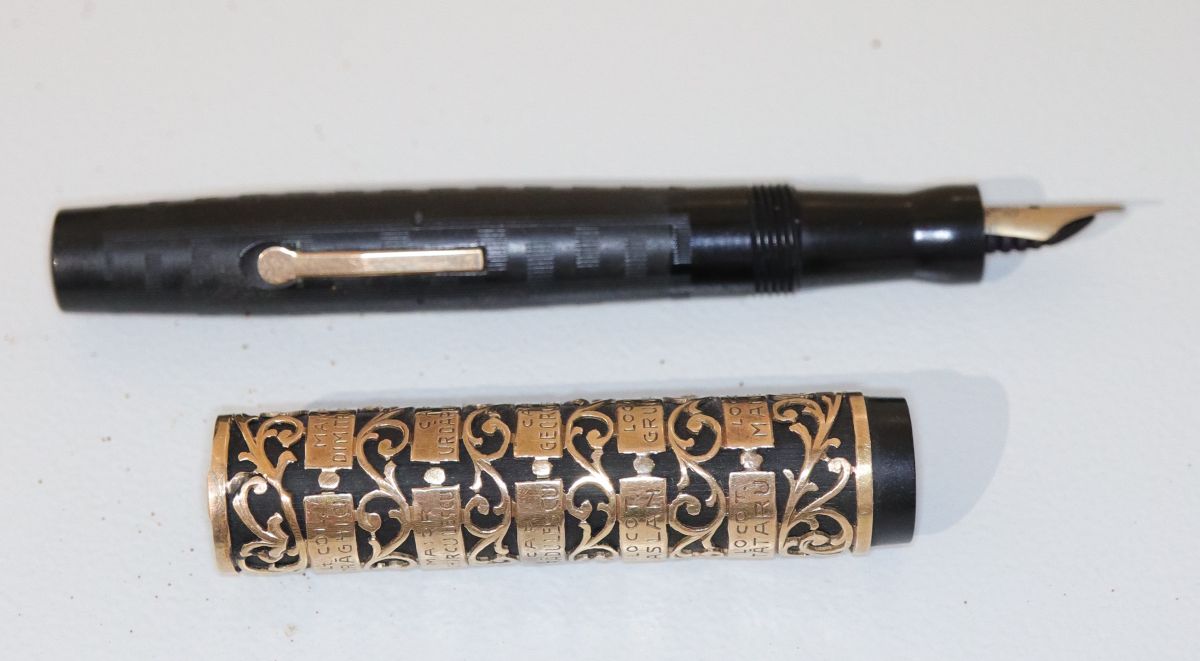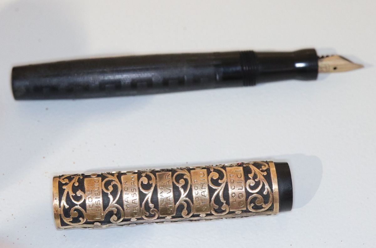 Descriere: Stilou de ebonită cu peniță de aur 579 ‰ având capacul cu îmbrăcăminte traforată din aur 570 ‰ pe care sunt aplicate 15 plăcuțe de aur pe care sunt gravate nume de ofițeri. Între plăcuțele cu numele lt. Salici și plăcuțele cu numele Lt. Tataru, lipsește un fragment.