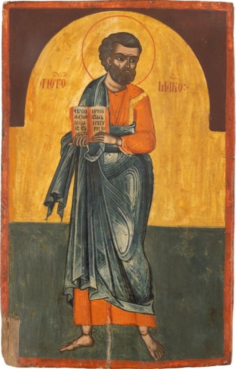 Descriere: Icoana face parte din aceeași serie cu Apostolul Simon și Apostolul Iacov și a fost realizată împreună cu acestea și cu icoana Apostolul Marcu, în cadrul aceleiași frize a Apostolilor din același iconostas brâncovenesc. Apostolul Marcu este redat în picioare, sub un arc cintrat, pe un fond galben-auriu în partea superioară a icoanei și verde în partea inferioară. Este ușor întors spre dreapta. Cu ambele mâini ține la piept o evanghelie deschisă, al cărei text este redat cu caractere chirilice, în limba română. Este înveșmântat cu un chiton roșu deschis și himation albastru, drapajul veșmintelor fiind executat în cute unghiulare, redate în aceeași culoare, în nuanțe mai închise pentru umbre și mai deschise pentru lumini. Conform Erminiei, este înfățișat ca un bărbat la maturitate, cu părul și barba castanii. Trăsăturile chipului, precum și modeleul acestuia, este realizat în nuanțe de ocruri, înscriindu-se în stilul picturii brâncovenești. Aureola din jurul capului este delimitată de fondul icoanei printr-o linie roșie. Un chenar lat, pictat cu roșu pe margini, delimitează câmpul icoanei. La fel, inscripția de desemnare a personajului este pictată cu roșu, cu litere chirilice, în limba română.