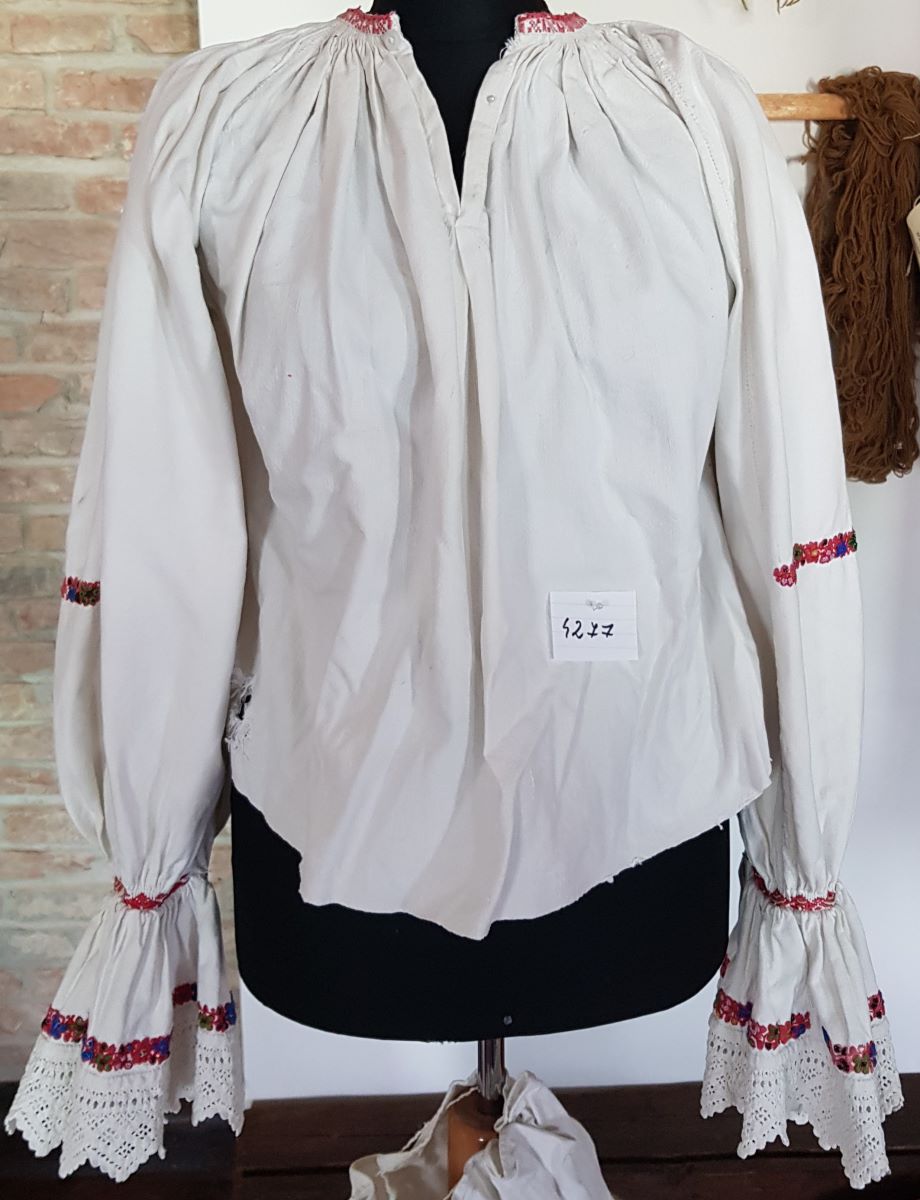 Descriere: Cămașă femeiască confecționată din pânză de casă, cu mâneca aplicată de la gât, cu platcă (pajă) la subsori, încrețită atât în față cât și în spate; mâneca cu volan, prinsă în creț. Decorul este dispus în jurul gâtului, pe piept, peste cot, pe creț și fodor (volan) care se termină cu dantelă croșetată cu colți. Decorul este realizat din motive geometrice: romb, zig-zag, x-uri și motive florale, cusute cu „șire”. Motivele decorative sunt completate cu mărgele colorate. Cromatica: roșu, albastru, verde.