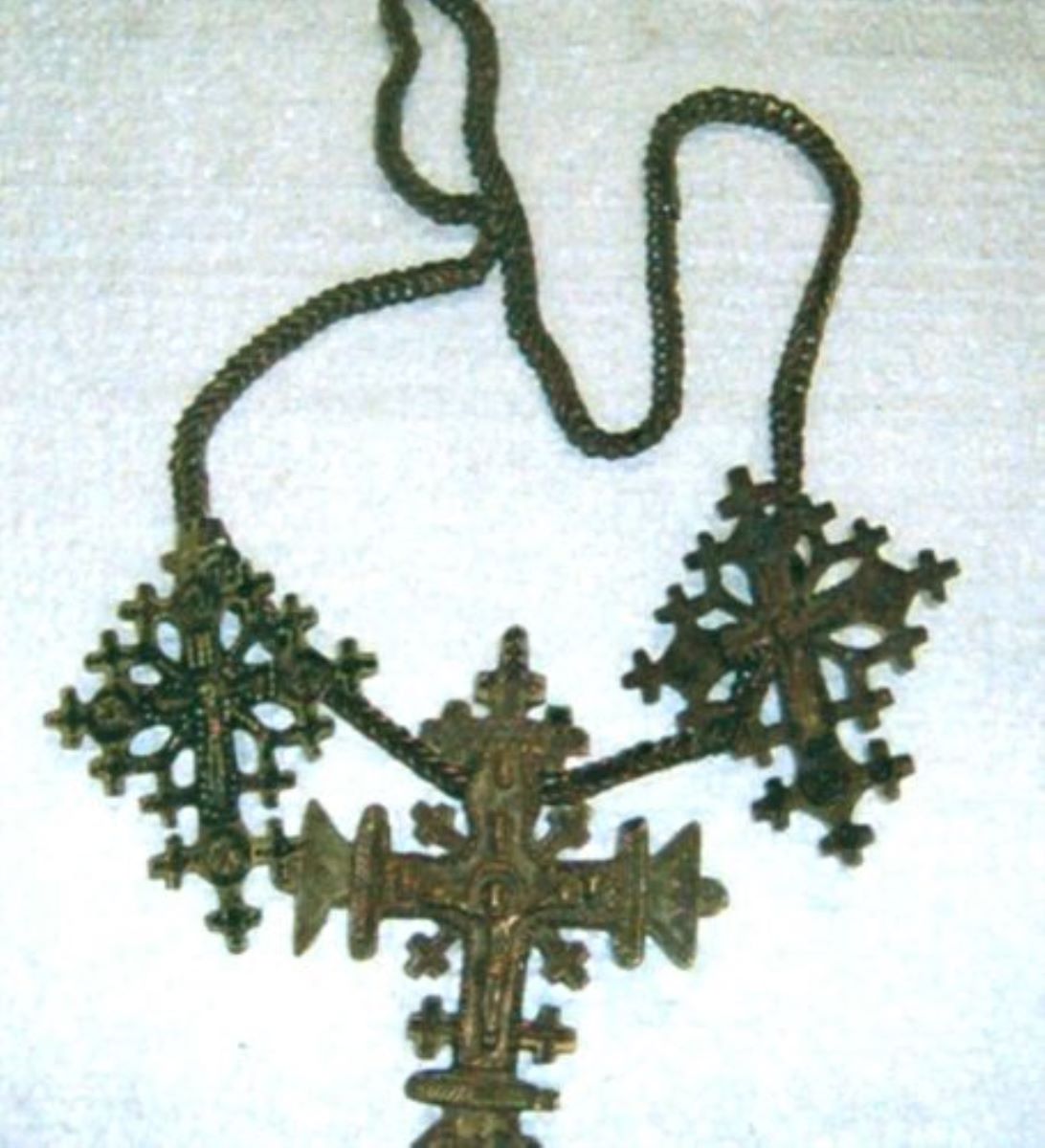 Descriere: Lanț din alamă, împletit, de care sunt atârnate trei cruci, una mai mare, centrală și două mai mici; decor pe cruci ștanțat cu motiv religios: Iisus Hristos răstignit; culoarea metalului cu patină.