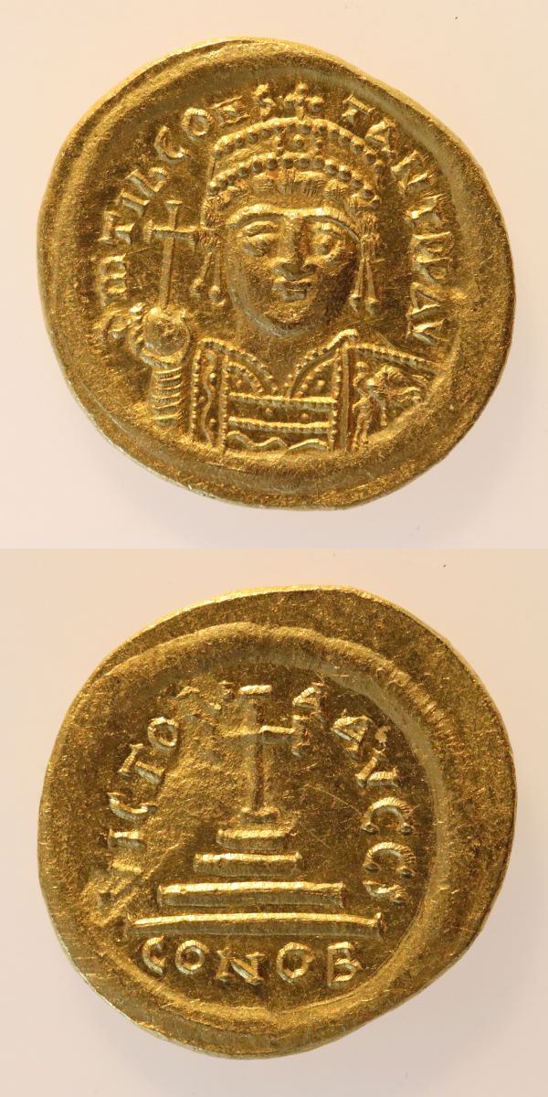 Descriere avers: Legendă dispusă circular pe margine. Central, bustul împăratului reprezentat frontal cu diademă crucigeră cu pendilia, cu platoșă și paludamentum. În mâna dreaptă un glob cruciger, în mâna stângă scut cu cavaler călare. Cerc liniar exterior.