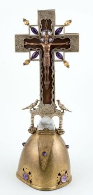 Descriere: Crucifix de masă, pe soclu în formă de cupolă, cu motive decupate și registre cu entrelacs incluzând caboșoane lila din ametiste; superior, ornament din cristal de stâncă alb, fațetat, având lateral două colonete terminate cu păsări afrontate, susținând cruce din lemn, cu bordură cu ferecătură metalică cu motive Jugendstil, central Isus crucificat, cu aură din metal galben și email alb; pe lateralele crucii baluștri mici dispuși oblic cu caboșoane lila, fixați de cruce de câte două tije metalice. Marcă: Sanktjohannsep; M. Strobl München.