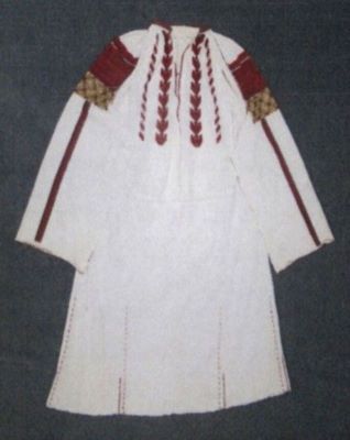 Descriere: Croi tip carpatic: cămașă cu poale atașate din talie prin intermediul unei bucăți industriale de pânză (intervenție ulterioară). Piesa este realizată din mai multe bucăți de pânză, unite între ele pentru a forma mânecile (o lățime și 1/2 de pânză, introduse sub guler printr-o fâșie îngustă de 10 cm), pieptul (o lățime despicată pe mijlocul feței, cu doi clini laterali de 1/4 din foaie) și spatele cămășii (o lățime, cu doi clini laterali de 1/4 din foaie). Toate bucățile de pânză sunt unite cu cheițe decorative și încrețite în jurul gâtului și fixate sub un guler-bentiță. Mânecile sunt largi, cu pavă pătrată la subraț. Gura cămășii se află pe mijlocul feței. Poalele sunt confecționate din două foi și patru clini laterali, prinse din talie de iie și finisate prin tivitre cu drug. Decorul este plasat pe mâneci (altiță cu șase rânduri, încreț, două râuri drepte), pe piept, de jur împrejurul deschiderii de la piept și câte două șiruri de motive flancând gura cămășii), pe spate (de-a lungul cusăturilor de îmbinare cu mânecile șir de motive individualizate), pe guler. Motive decorative geometrice romburi (altiță, râuri), zigzag (guler), motive astrale stele înscrise în rețea de romburi (încreț), „furci” (piept), motive vegetale: boboci (șiruri pe lîngă cusături). Cromatică: pânză albă, motive cu roșu vișiniu, galben, albastru, tel și fir metalic argintiu.