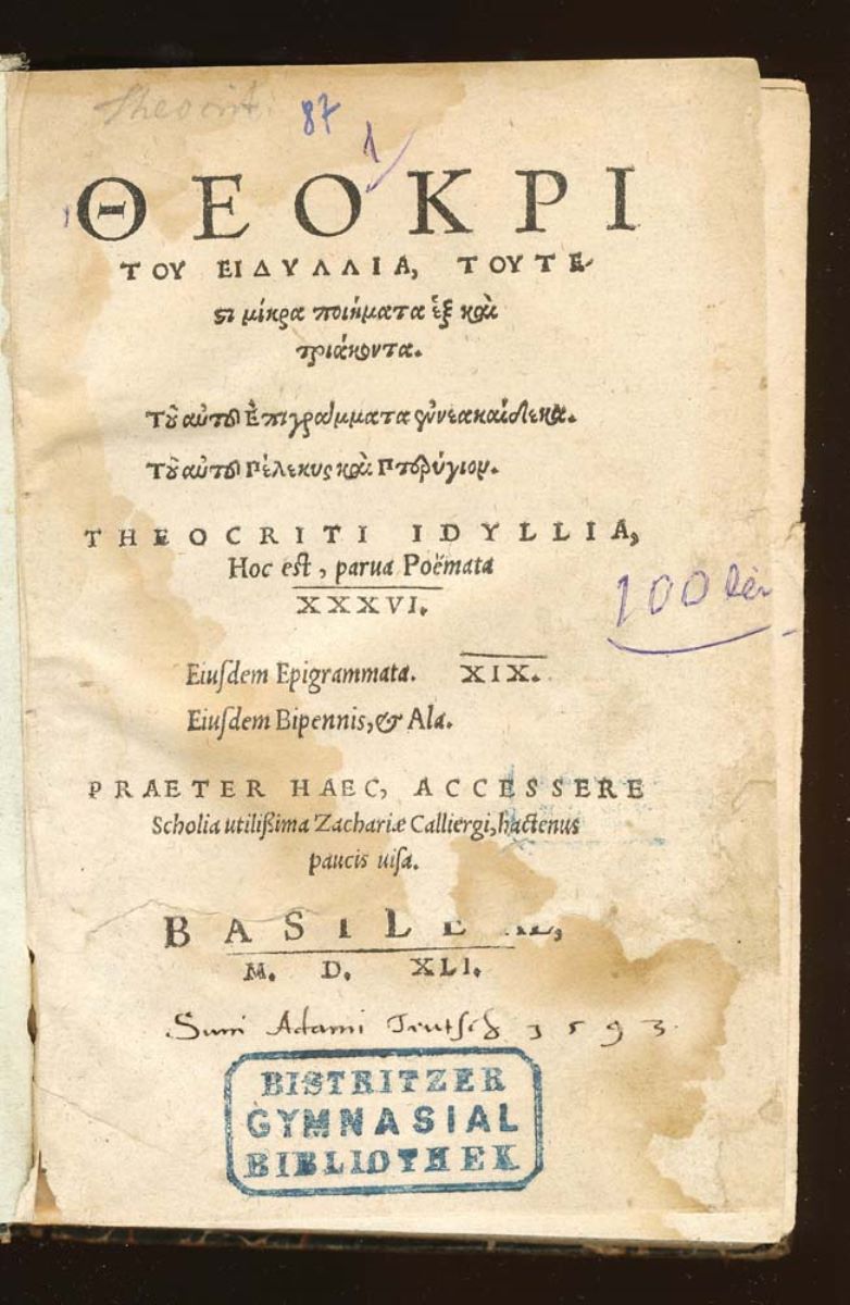 Autor: Theocriti, Zachariae Calliergi, Andreae Cratandri