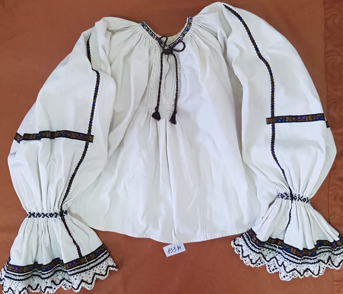 Descriere: Cămașă femeiască confecționată din pânză de casă, țesută în 2 ițe. Gura în față; de o parte și alta a gurii cămașa prezintă mai multe cute orizontale, (mărginite cu colțișori) care se termină cu o bucățică de pânză. Încrețită la gât, cămașa este prevăzută cu un guler îngust, brodat cu motive florale. Mâneca largă pornește de la gât, cu platcă la subsoară. Deasupra fodorului mâneca este prinsă în creț; mâneca se termină cu fodor (volan) încrețit, mărginit cu dantelă croșetată. Decorul realizat cu alesaturi peste fir se reduce la motivele dispuse pe guler, la șirele peste cot, șirul vertical care străbate mijlocul mânecii și cele de la fodor. Motivele sunt relizate cu bumbac negru, albastru, mov, nuanțe de maro.