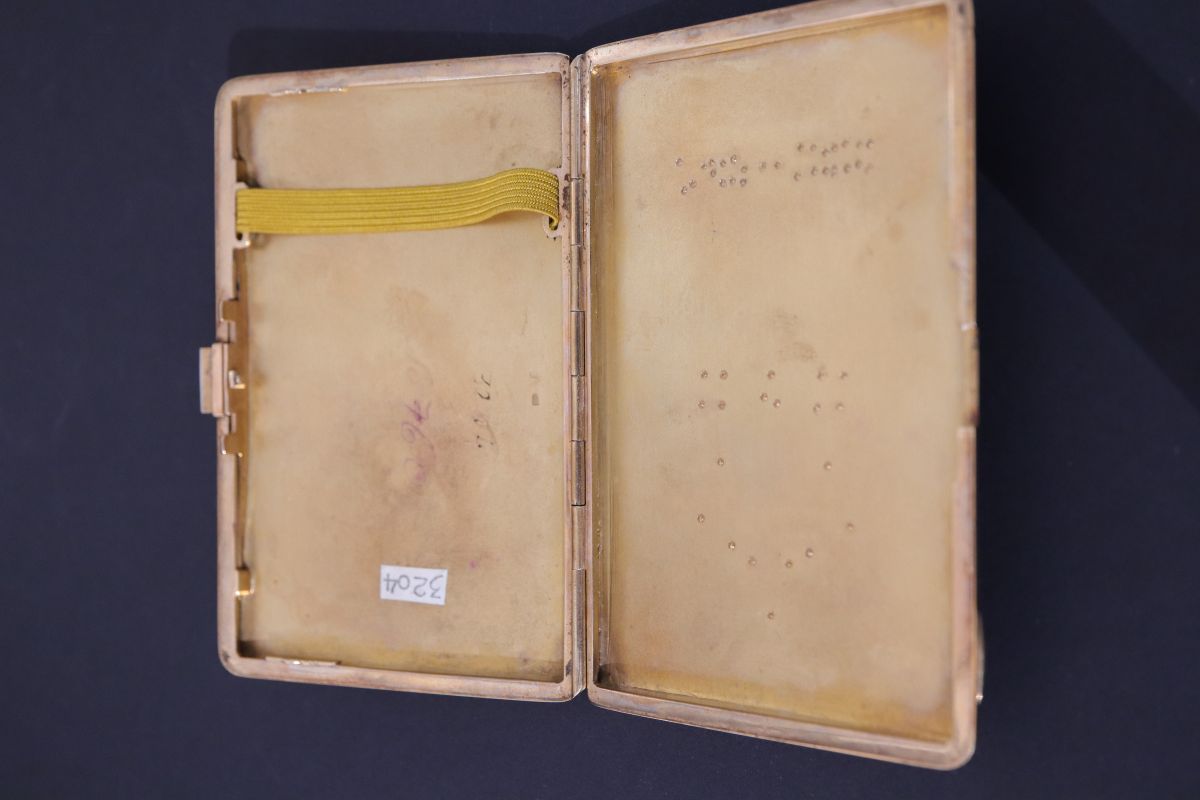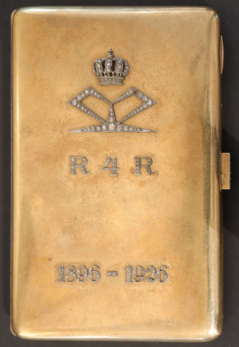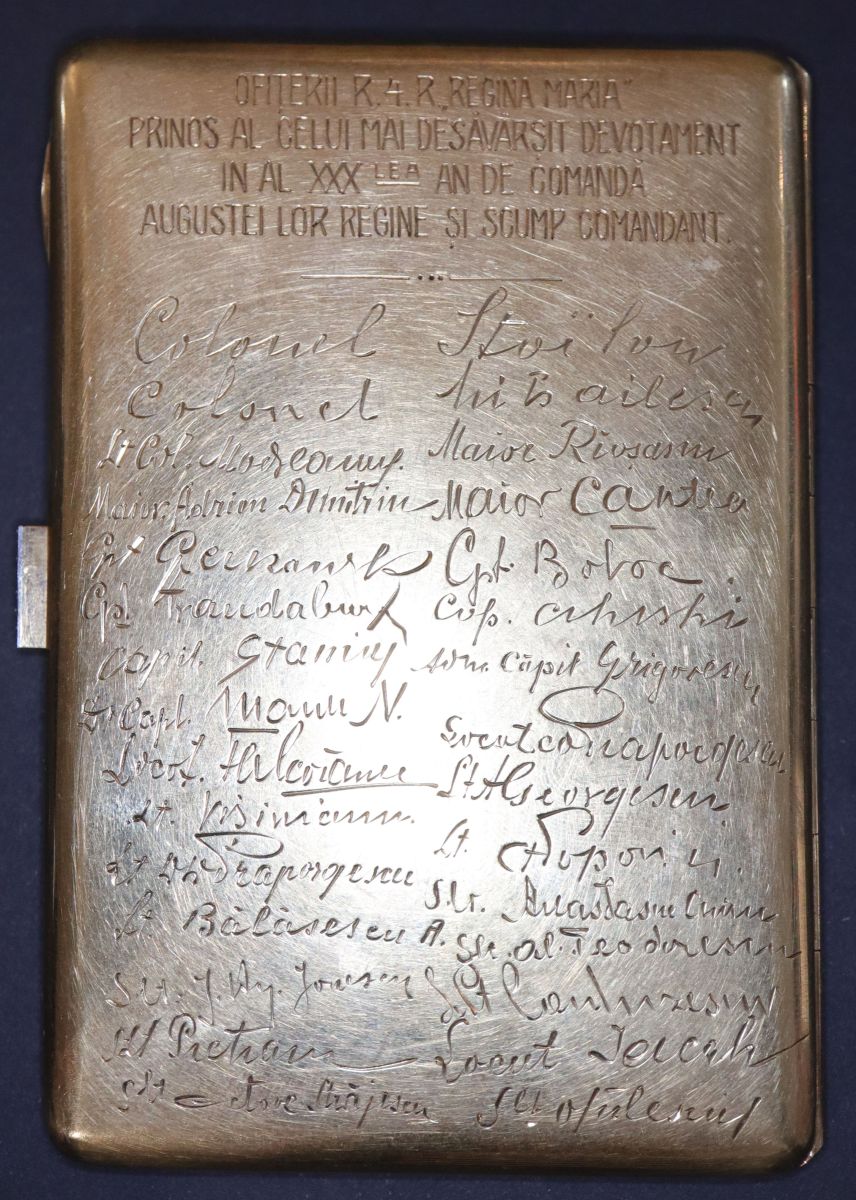 Descriere: Port țigaret de formă dreptunghiulară având pe partea frontală cifrul reginei Maria, literele R 4 R și inscripția 1896 - 1926. Toate aceste inscripții aplicate sunt bătute în diamante. Pe verso are dedicații și semnături gravate. Lipsesc șapte diamante de la fermoarul port țigaretului. Are lipsă un diamant la cifrul Reginei Maria. Din cifra „1926” lipsește un mic diamant de la cifra 9. Pe față are inscripționat cifrul reginei Maria, R 4 R (referire la Regimentul 4 Roșiori în care a activat Regina) și 1896 - 1926, iar pe verso „Ofițeria R 4 R „Regina Mama” prinos al celui mai desăvîrșit devotament în al XXX-lea an de comanda, augustei lor regine și comandant - 28 sept”. La interior, port țigaretul este nedecorat și fără cătușeală textilă, având doar un elastic de culoare galbenă pentru a ține țigările.